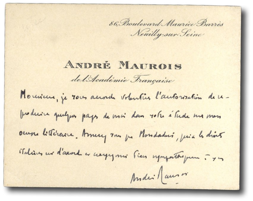 >Biglietto da visita ''André Maurois de l'Académie Française''. Testo vergato in inchiostro nero: ''Monsieur, je vous accord volentier l'autorization de reproduire quelque pass de moi dans votre étude sur mon oeuvre litteraire. Assurez vous que Mondadori qui a les droits italiens....''. Biglietto indirizzato a qualche traduttore o biografo dell'opera di Maurois in italia. André Maurois, pseudonimo di Émile Salomon Wilhelm Herzog (Elbeuf, 26 luglio 1885 – Neuilly-sur-Seine, 9 ottobre 1967), è stato uno scrittore francese. Ebbe sempre il gusto dell'erudizione e della fantasticheria ed unendole inventò un nuovo genere letterario: la biografia romanzata.
