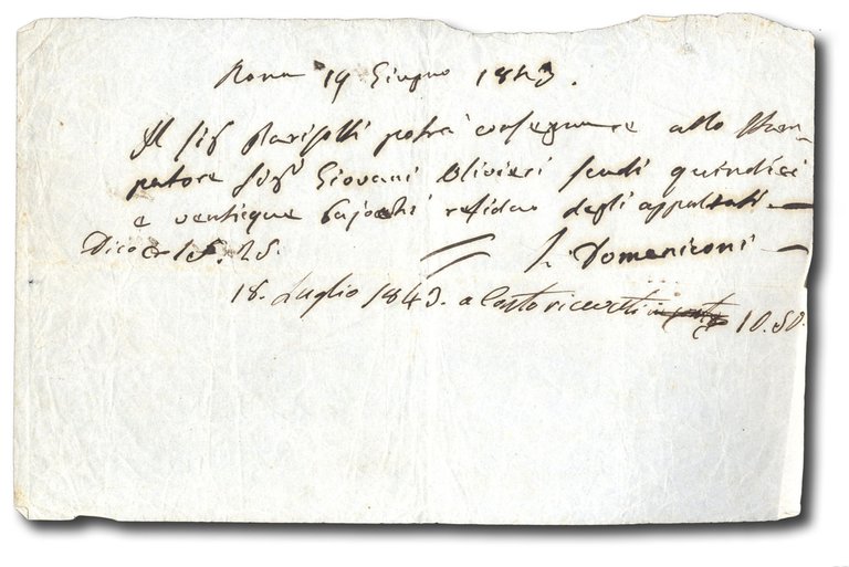 >mm 135x210; ordine di pagamento di 15 scudi e 25 baiocchi allo stampatore Giovanni Olivieri.