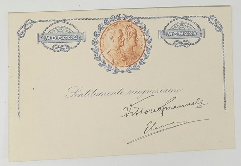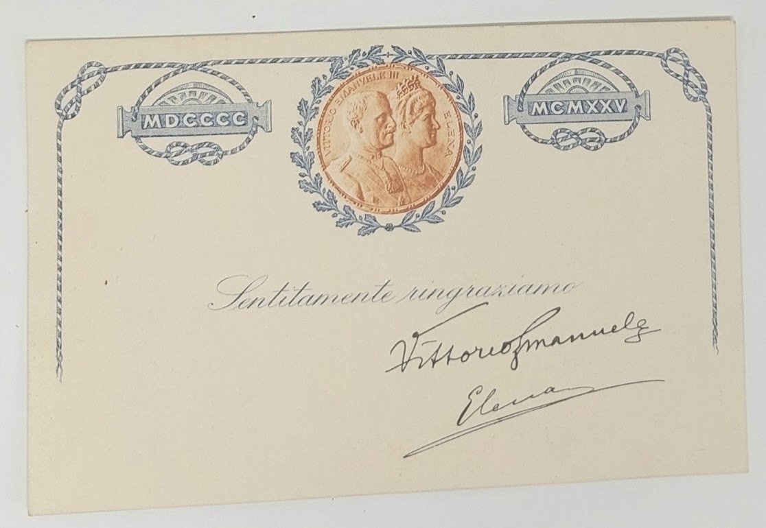>Biglietto di ringraziamento indirizzato alla Sig.ra "Clara Toselli in Mondino, Corso Belgio 19, Torino". Al verso, in alto centrale, il medaglione con il ritratto dei sovrani, nella parte centrale è stampata la dicitura "Sentitamente ringraziamo"seguono le firme autografe di Vittorio Emanuele III (1869-1947) e dalla Regina Elena di Montenegro (1873 - 1952), Regina consorte d'Italia fino al 9 maggio 1946. Perfettamente conservato.