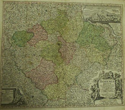 Carta geografica incisa in rame, a colori, di cm. 53 x 62 ca. Pregevole e ricco cartiglio in alto a destra raffigurante un panorama della città di Carlsbad, altro pregevole cartiglio animato, con scala, in basso a destra e leggenda , sempre con ricca inc. animata, in basso a sinistra.