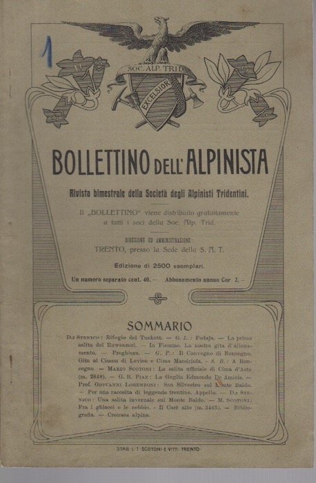 Bollettino dell'alpinista: rivista bimestrale della Società degli alpinisti tridentini: A. III - N. 1 - luglio agosto 1906. | Rare and modern books |