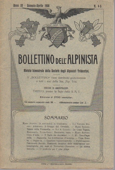 Bollettino dell'alpinista: rivista bimestrale della Società degli alpinisti tridentini: A. IV - 4-5 - gennaio aprile 1908. | Rare and modern books |