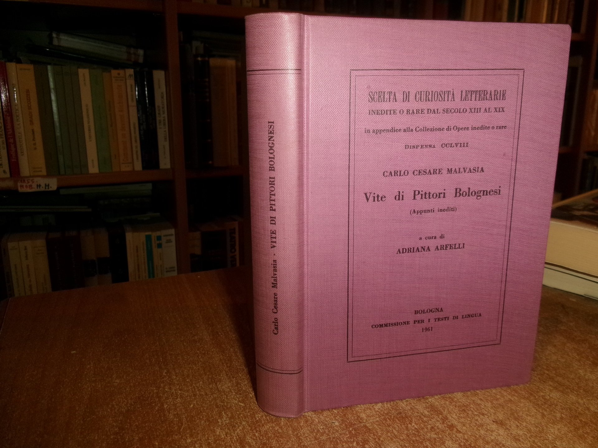 (Bologna) CARLO CESARE MALVASIA. Vite di Pittori Bolognesi (appunti inediti). A cura di Adriana Arfelli. Bologna, Tip. Azzoguidi, 1961, In-16° grande, tela edit. XLIX, 174 pp. In ottimo stato di conservazione. Neg. mob. nero W in basso.