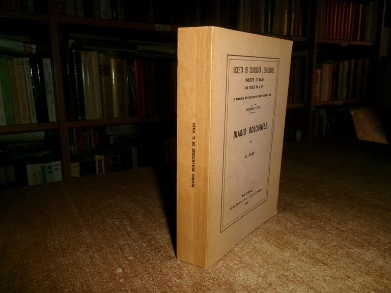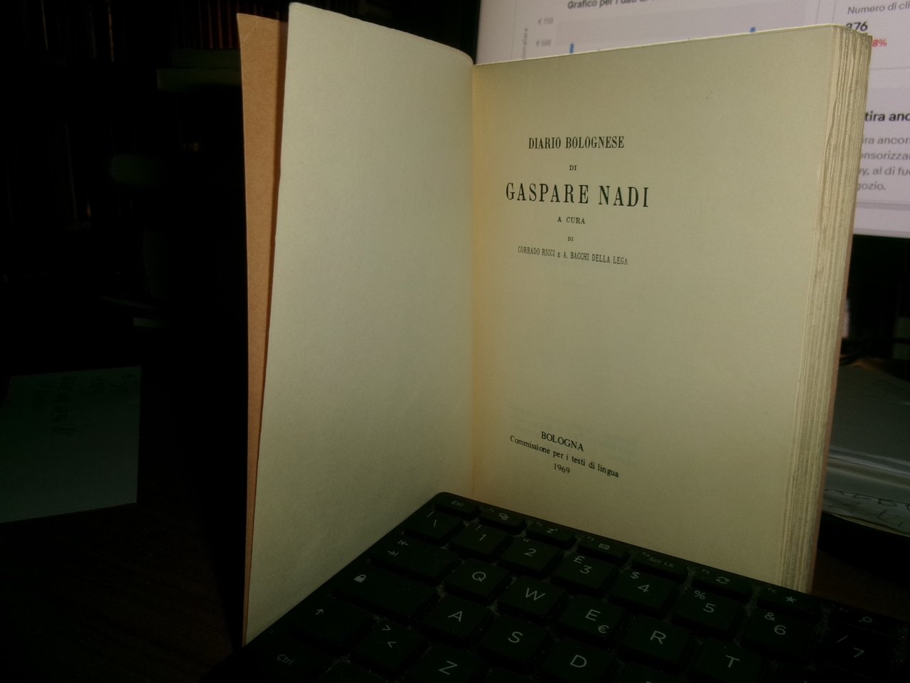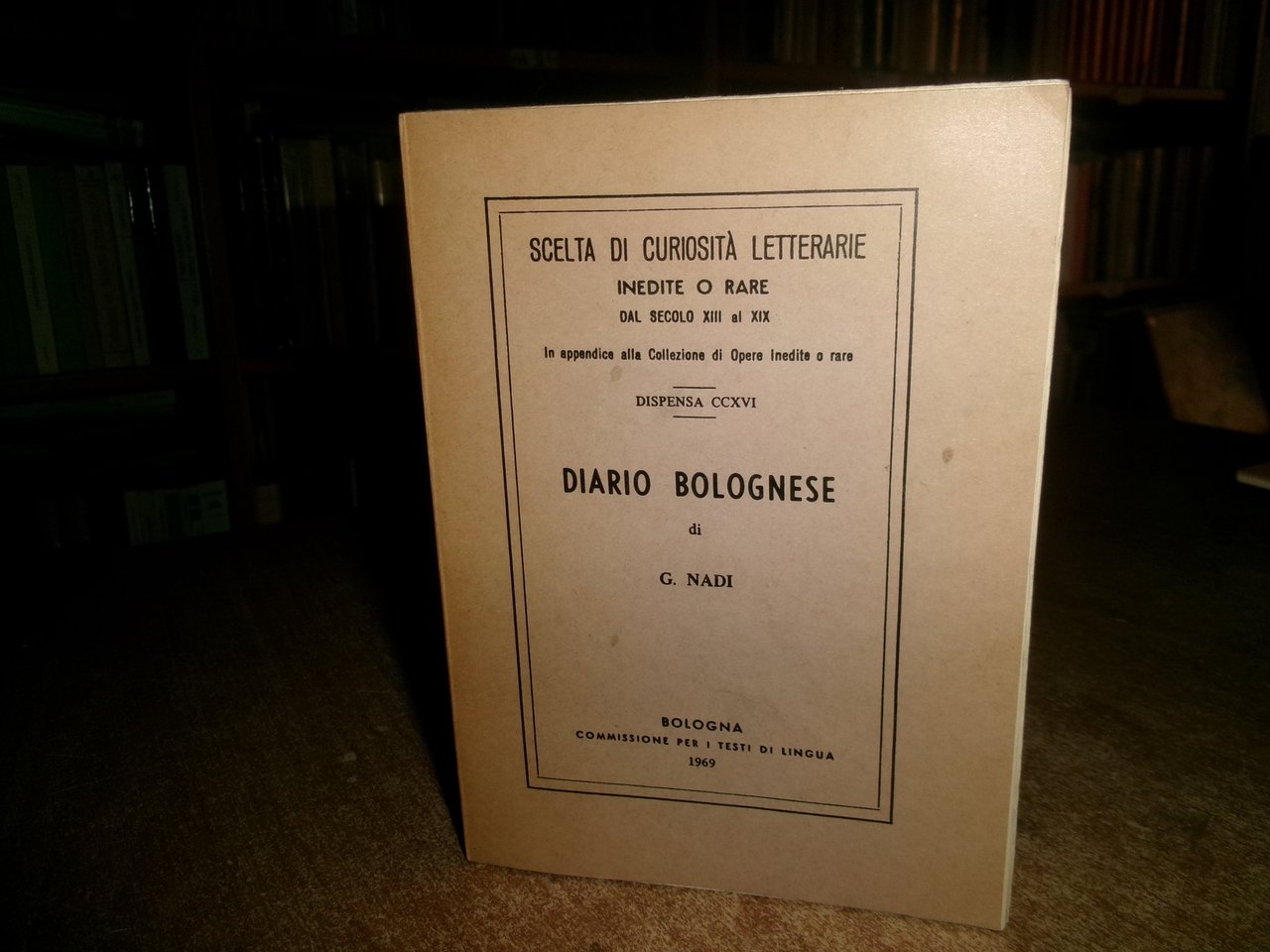 (Bologna) Diario Bolognese di Gaspare Nadi a cura di Corrado Ricci e Bacchi della Lega. Bologna, Editrice Forni, 1969. Ristampa fotomeccanica eseguita dalla Editrice Forni di Bologna sulla edizione di Gaetano Romagnoli, 1886. In-16°, br. edit. xxvii, 394 pp. In ottimo stato. Neg. mob. nero W in basso