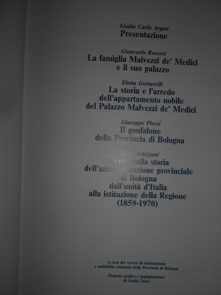 (Bologna) Presentazione di Giulio Carlo Argan. Bologna, Grafis, 1981. Palazzo Malvezzi tra storia arte e politica. In-4°, tela edit. con sovracopertina. 300, (1) pp. con numerose illustrazioni fotografiche in bianco e nero anche a piena pagina nel testo. In ottimo stato di conservazione. Uff. TV. mob. nostro carc.