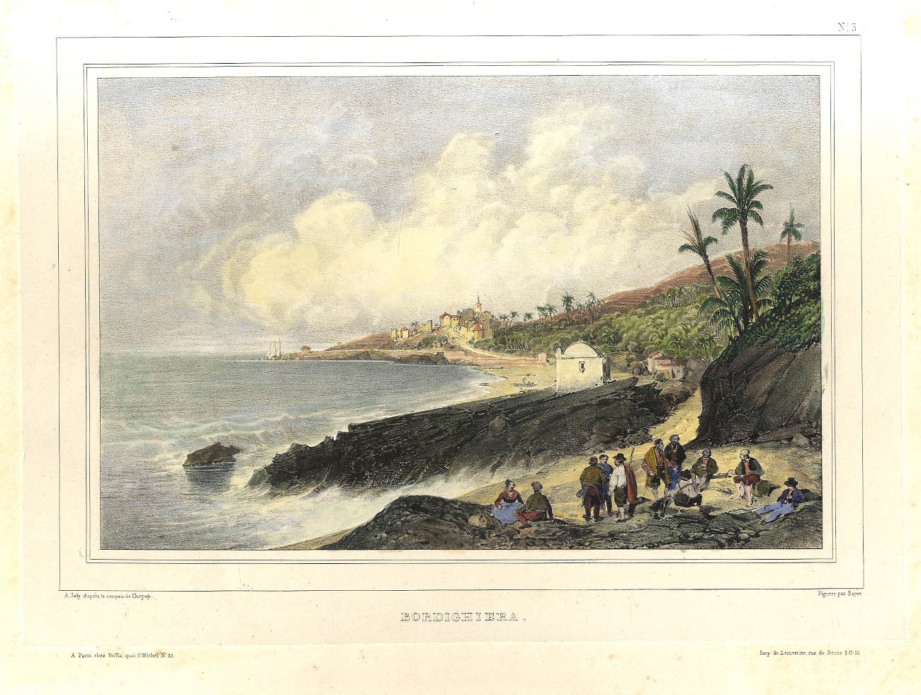 >Litografia (cm. 30x43) eseguita da A. Cuvillier su disegno di Nicolas Chapuy, colorata da mano coeva. Tratta dalla raccolta: Promenade de Nice à Gênes dessinée d'après nature par Chapuy et lithographiées par Cuvillier, Deroy, J.C. Joly, Monthelier, Tirpenne. Paris, Bulla, Sans année (ma 1837). Esemplare in perfetto stato di conservazione.