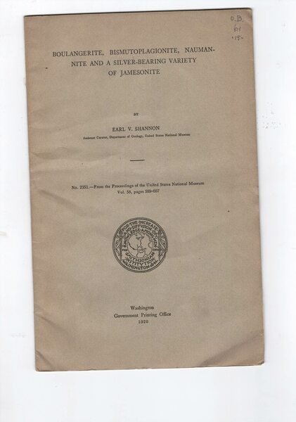 Boulangerite, bismutoplagionite, naumannite and a silver bearing variety of jamesonite. N. 2351 - From te Proceeding of the United States National Museum, Vol. 58, pp. 589 - 607.