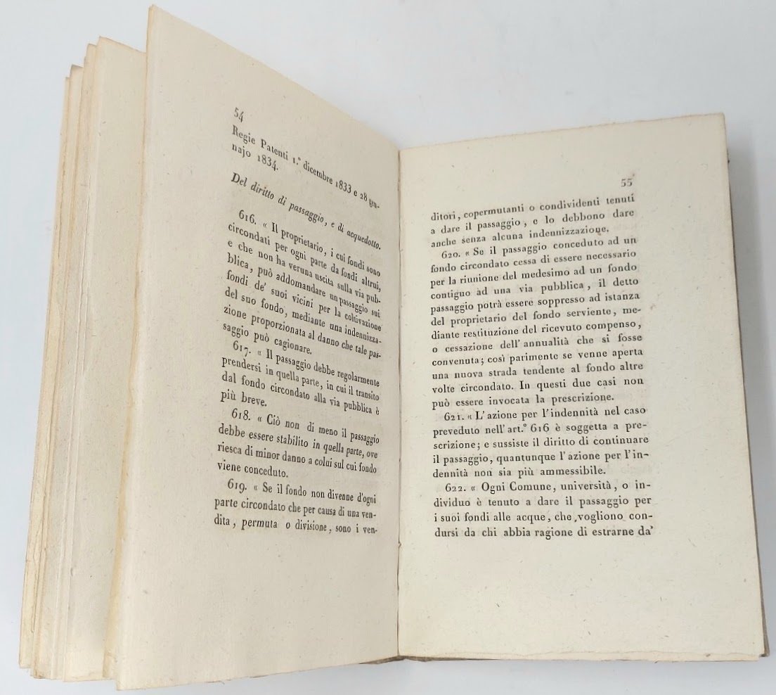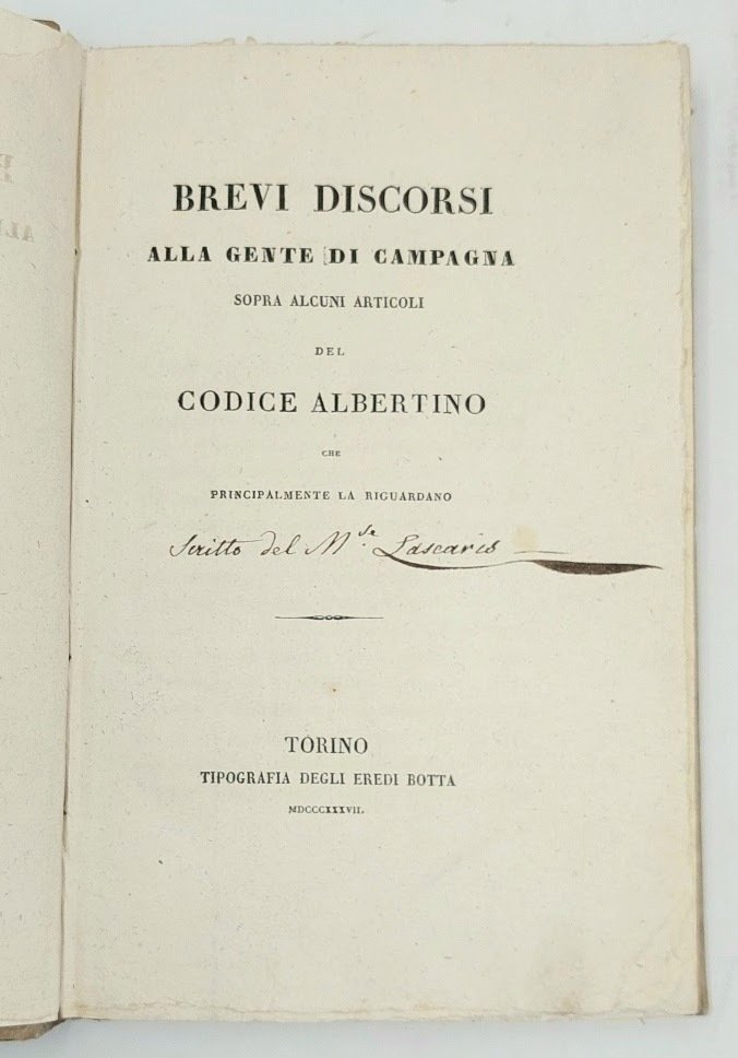 >in-8, pp. 188, leg. coeva cart. muto. Prima edizione di questo studio di esegesi giuridica, scritto ''per agevolare la classe degli agricoltori...che mercé il nuovo Codice Albertino, potrà francamente e con piena cognizione de' suoi diritti e de' suoi doveri, regolare i propri contratti, definire le controversie...'' (dal ''Discorso preliminare''). Magnifico esemplare su carta forte, intonso. Sul titolo la nota manoscritta: ''Scritto dal M.se Lascaris'', al contropiatto anteriore "Omaggio dell'Autore, 1838" Manno-Promis I, 2873.