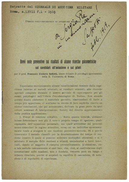 BREVI NOTE PREVENTIVE SUI RISULTATI DI ALCUNE RICERCHE PSICOMETRICHE SUI CANDIDATI ALL'AVIAZIONE E SUI PILOTI. Estratto.