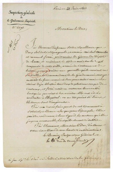 1 S. Gr.-4to. In französischer Sprache an Kriegsminister Henri Clarke d’Hunebourg, Duc de Feltre (1765-1818). - Auf Briefpapier mit Briefkopf der "Inespection générale de la Gendamerie Imperiale".
