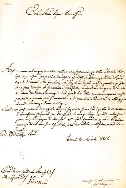 1 S. auf Doppelblatt. Groß-4to. An den Wiener Erzbischof Joseph Othmar von Rauscher (1797-1875) mit Dank für Weihnachtswünsche: "Agli innumerevoli auguri inviatimi nella vicina sopravvenienza della solennità natalizia di pienissima prosperità e benedizioni, essendosi la Eminenza Vostra reverendissima degnata di unire nella sua benignità singolare le più cortesi e gentili espressioni, io ne sono rimasto eccessivamente mortificato, conoscendomi incapace di meritare cotanto da Vostra Eminenza [.]". - In seiner Zeit als Priester und Direktor der orientalischen Akademie in Wien war Joseph Othmar von Rauscher (1797-1875) einer der Prinzenerzieher des späteren Kaisers Franz Joseph I., mit dem ihm seither ein enges Vertrauensverhältnis verband. 1849 wurde er zum Fürstbischof von Seckau ernannt, 1853 erfolgte die Weihe zum Erzbischof von Wien. In dieser Funktion traute er am 24. April 1854 das Kaiserpaar Franz Joseph I. und Elisabeth in der Wiener Augustinerkirche. Als Erzbischof war Rauscher maßgeblich am Zustandekommen des 1. Konkordates beteiligt, das am 18. August 1855 unterzeichnet wurde und den Josephinismus beendete. Am 17. Dezember 1855 kreierte Papst Pius IX. Rauscher zum Kardinal. Am Ersten Vatikanischen Konzil nahm Raucher als Konzilvater teil. Er führte die Fraktion der „Inopportunisten“ an, die das Dogma der Unfehlbarkeit des Papstes aus kirchenpolitischen Gründen ablehnten. - Wohl erhalten.