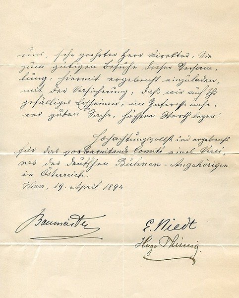 2 SS. auf Doppelblatt. Gr.-4to. Gemeinschaftlich verfaßter Brief der mitunterzeichnenden Bühnenkünstler Bernhard Baumeister, Ernst Niedt und Hugo Thimig an einen namentlich nicht genannten Direktor: "Seit längerer Zeit beschäftigt sich ein vorbereitendes Comité mit der Gründung eines Vereins, dessen Zweck die corporative Wahrung der Interessen der deutschen Bühnenangehörigen in Österreich ist. - Montag, den 23. d. M. Nachmittag präcise 3 Uhr findet im alten Rathaussaale [.] eine Versammlung österreichischer Bühnenmitglieder statt, in welcher die Statuten dieses neuen Vereines [.] kundgemacht [.] werden [.]". - Bernhard Baumeister, von Heinrich Laube nach Wien geholt, war 65 Jahre lang Ensemblemitglied des Wiener Burgtheaters. "'Sein Stil', sagt Jakob Minor, 'ist der echte, alte Burgtheaterstil, in einer starken und liebenswürdigen Individualität verkörpert'. 'Wo Bernhard Baumeister steht, da steht für die Kunst ein Wegweiser von den Künsten zurück zur Natur', formuliert Wilbrandt" (zit. n. Ernst Haeusserman, Das Wiener Burgtheater, Wien u. a., Molden, 1975, S. 61). Am Ende seiner langen Laufbahn angekommen, konnte der gleichermaßen als Regisseur gefragte Schauspieler auf 6299 Auftritte in 494 Rollen zurückblicken (vgl. Czeike I, 284). - Mit zwei größeren Randeinrissen.