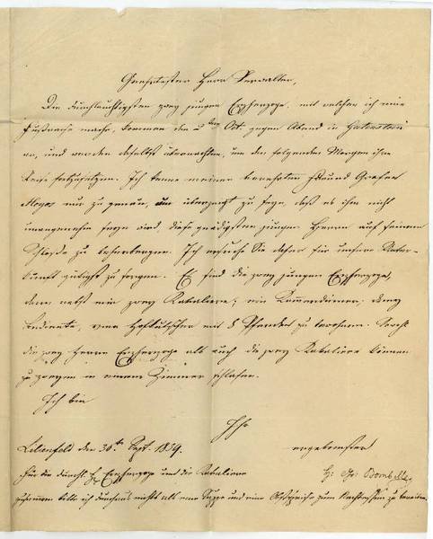 1 S. auf Doppelblatt. 4to. Mit Adresse (Faltbrief). An Herrn Krickl, Verwalter der Herrschaft Gutenstein: "Die Durchlauchtigsten zwey jungen Erzherzoge, mit welchen ich eine Lustreise mache, kommen den 2ten Oct. gegen Abend in Gutenstein an, und werden daselbst übernachten, um den folgenden Morgen ihre Reise fortzusetzen. Ich kenne meinen verehrten Freund Grafen Hoyos nur zu genau, um überzeugt zu seyn, daß es ihm nicht unangenehm seyn wird, diese gnädigsten jungen Herren auf seinem Schloße zu beherbergen. Ich ersuche Sie daher für unsere Unterkunft gütigst zu sorgen. Es sind die zwey jungen Erzherzoge, dann nebst mir zwey Kavaliere; ein Kammerdiener; drey Bediente, vier Hofkutscher und 8 Pferde zu bewohnen. Sowohl die zwey Herren Erzherzoge als auch die zwey Kavaliere können zu zweyen in einem Zimmer schlafen […]". - Heinrich Franz Graf von Bombelles (1789-1850) übernahm im Jahr 1836 in Wien die Erziehung der Enkel des Kaisers Franz II., des späteren Kaisers Franz Joseph und seiner Brüder, und begleitete sie im Mai 1848 auf ihrer Flucht nach Innsbruck.