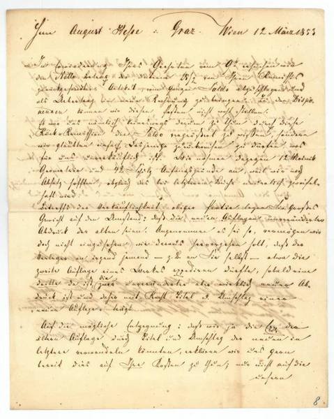 2 SS. auf gefalt. Doppelblatt. 4to. Eh. adressiert. An den Verleger August Hesse in Graz: "In Erwiderung Ihres Geehrten vom 9ten ersuchen wir den Netto-Betrag der, unterm 28/2 von Ihren Remissis zurückgesandten Artikel, vom ganzen Saldo abzuschlagen und als Uebertrag in neue Rechnung zu bringen. Zu den Disponensen können wir diesen Posten nicht wohl stellen. Es war uns nämlich keineswegs darum zu thun durch diese Rück-Remission den Saldo vergrößert zu wissen, sondern wir glaubten einfach dasjenige zurückweisen zu dürfen, was für uns unverkäuflich ist […] Betreffs Verkäuflichkeit obiger Partie legen Sie großes Gewicht auf den Umstand, daß die neuen Auflagen unveränderter Abdruck der alten seien. Angenommen es sei so, vermögen wir doch nicht einzusehen, wie daraus hervor gehen soll, daß der Verleger an irgend jemand - z. B. an Sie selbst - etwa die zweite Auflage eines Werkes expedieren dürfte, sobald eine dritte da ist, die zwar unveränderter aber wirklich neuer Abdruck ist und daher mit Recht Titel u. Umschlag einer ‚neuen Auflage' trägt […]". - Signiert "Carl Gerold&Sohn". Darunter eine eigenh. Notiz mit Unterschrift von Friedrich Gerold bezüglich eines "Mozart Lehrbuchs für Ober Gymnasium". - Friedrich und sein Bruder Moritz Gerold wurden 1843 von deren Vater Carl Gerold bereitz 1843 zu Gesellschaftern seines Verlages gemacht. 1849 wurde ihnen die Leitung übertragen - seither firmierte die Firma als "Gerold & Sohn". Nach Carls Tod 1854 gingen die Befugnisse dennoch zunächst an seine Witwe über und erst 1855 an Moritz Gerold. Friedrich Gerold übernahm 1841 die Leitung einer von seinem Vater und der Witwe des Leihbibliothekars Carl Armbruster gegründeten Leihbibliothek, die bis in die 60er Jahre führend blieb.