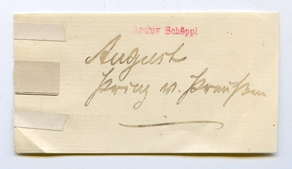 53:98 mm. August, jüngster Sohn des Prinzen Ferdinand von Preußen und Neffe Friedrichs II., befehligte im Alter von 24 Jahren ein Grenadierbataillon in Berlin, kämpfte 1806 bei Jena, wurde bei Prenzlau gefangengenommen, 13 Monate in Frankreich festgehalten und nach dem Tilisiter Frieden 1808 zum Generalmajor ernannt. Er nahm am Befreiungskrieg teil und bemühte sich, seit 1814 General der Infanterie, als Generalinspekteur der Artillerie um deren umfassende Reorganisation. - Mit Stempel des "Archiv Schöppl" am oberen und kleinen Montagestreifen am linken Blattrand.