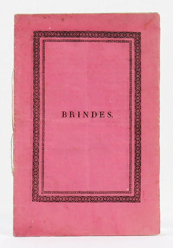 - brossura editoriale color rosa stampata in nero, legata a filo, con doppia cornice editoriale ai piatti che inquadra il titolo Brindes al piatto superiore, «Prezzo centesimi 50» a quello inferiore; catalogo editoriale di A. Stella stampato ai contropiatti,