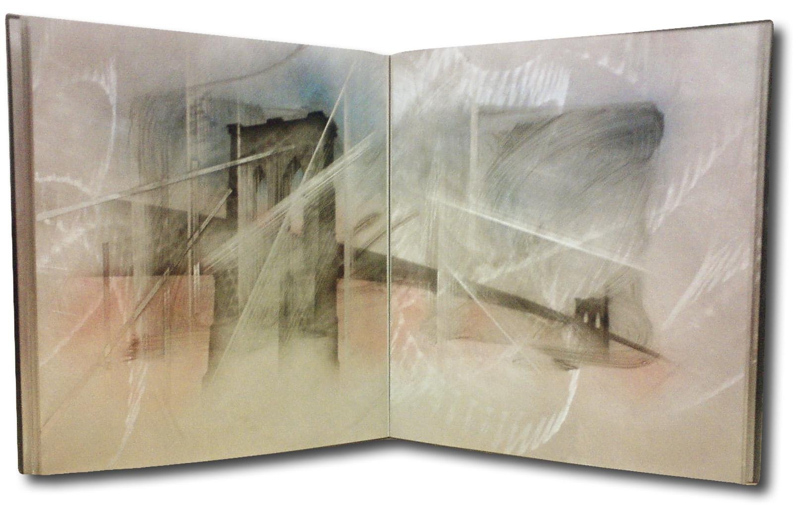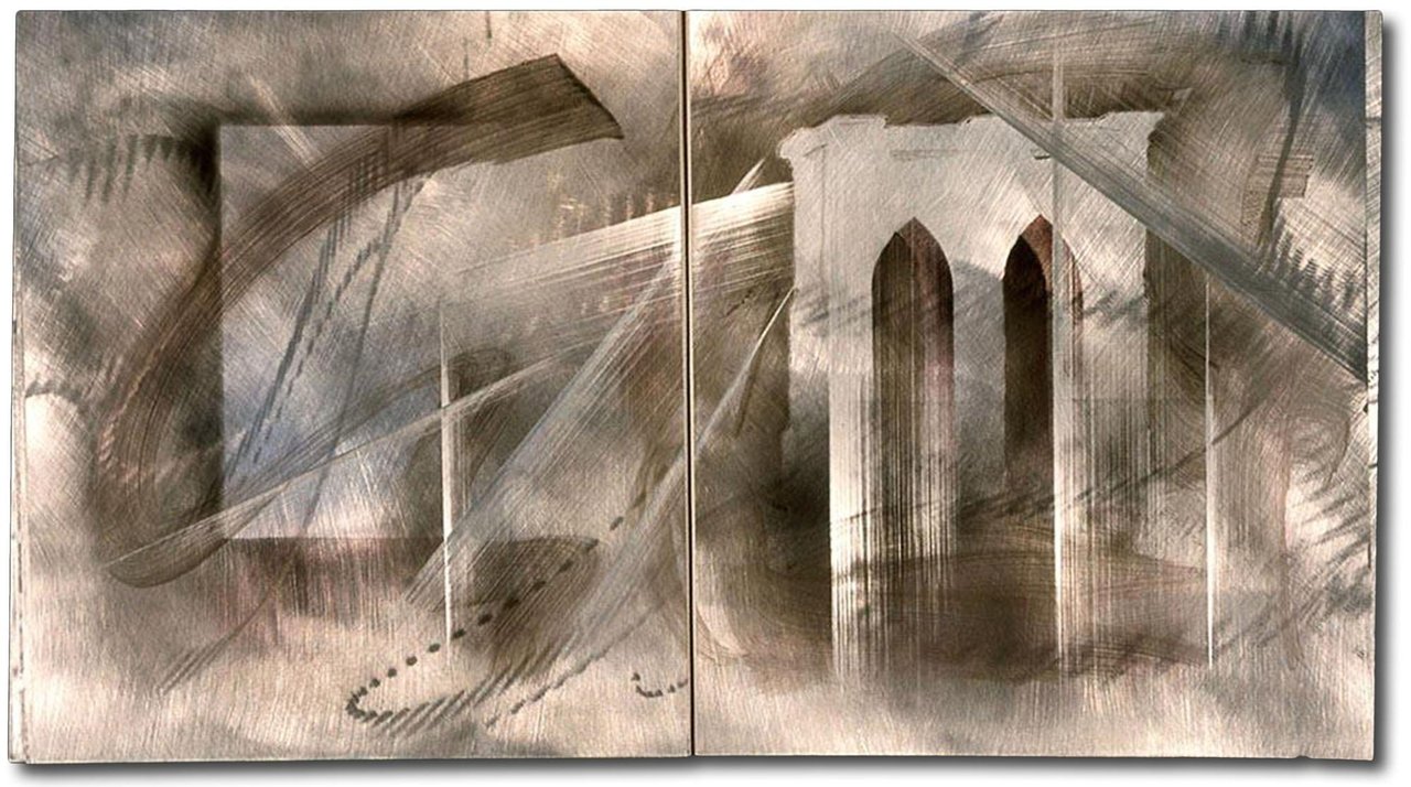 Introdotto da una poesia di Glaister, le 5 rappresentazioni del Ponte di Brooklyn sono in acrilico su alluminio smerigliato, dipinti a doppia pagina che raffigurano il Ponte in diversi momenti dell'anno o della giornata e da diverse angolazioni. Anche le illustrazioni astratte comunicano grande realismo proprio in virtù dei materiali e della composizione, che evoca sia la forza dell'acciaio, sia la nebbia che sale dall'East River. Alternati ai dipinti, troviamo 9 studi astratti, sempre realizzati su fogli d'alluminio che esplorano il concetto di ponte, anche attraverso l'uso di materiali inusuali: pittura acrilica, cavi, chiodi, sabbia frammenti metallici. Sia i dipinti sia gli studi sono diversi, benché simili, in ogni copia dell'opera. Esemplare in perfetto stato di conservazione, completo di opuscolo cartaceo di presentazione con copertina metallizzata.