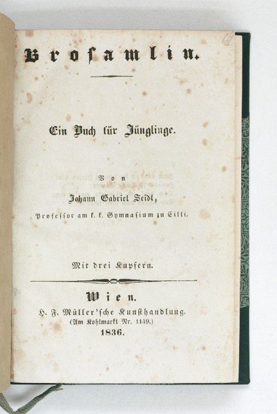 VI, (2), 267, (1) SS. Mit gest. Frontispiz, gest., ill. Titel und 1 gest. Tafel. Grüner Halbleinenband mit goldgepr. Rückentitel und -vergoldung. Lesebändchen. Kl.-8vo. Erste Ausgabe. - Der Schriftsteller Johann Gabriel Seidl (1804-75) war auch Zensor und Kustos des Wiener Münz- und Antikenkabinetts. Seine "Publikationen lyrischer Kleinformen [.] machten ihn bei den Zeitgenossen populär [.] Seidl gilt als bedeutender Vertreter der literarischen Vormärzpublizistik und Biedermeierpoesie Österreichs" (DBE). - Papierbedingt durchgehend etwas braun- bzw. stockfleckig. - WG² 18.