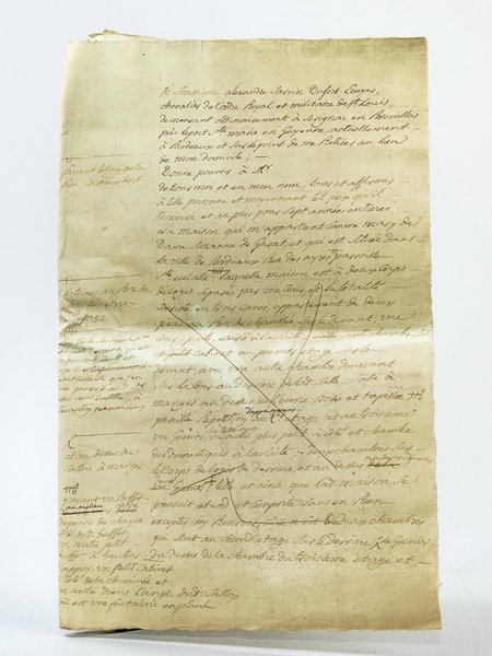 Brouillon de pouvoir juridique évoquant des propriétés louées à Bordeaux : "Je soussigné Alexandre Sarrin Dufort Ecuyer chevalier de l'ordre Royal et militaire de Saint Louis, demeurant ordinairement à Sérignac en Breuillois près le Port Ste Marie en Guyenne, actuellement à Bordeaux et sur le point de me retirer au lieu de mon domicile, donne pouvoir à M. de pour moi et en mon nom, louer et affermer à telle personne et moyennant tel prix qu'il trouvera et au plus pour sept années entières la maison qui m'appartient comme mary de Dame Suzanne de Garat et qui est situées dans la ville de Bordeaux rue des Ayres paroisse Sainte Eulalie [ Avec de longs descriptifs de la maison ]
