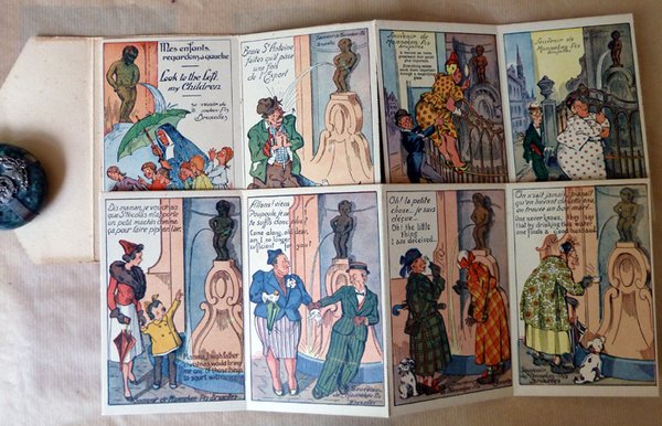 Un carnet sous forme d'enveloppe illustrée en trois couleurs contenant 10 cartes postales attachées, toutes en couleurs. Cartes postales comiques paillardes dans la tradition bruxelloises. Quelques cartes détachées. Bien complet des 10 cartes. Bel état. Voir Photos.