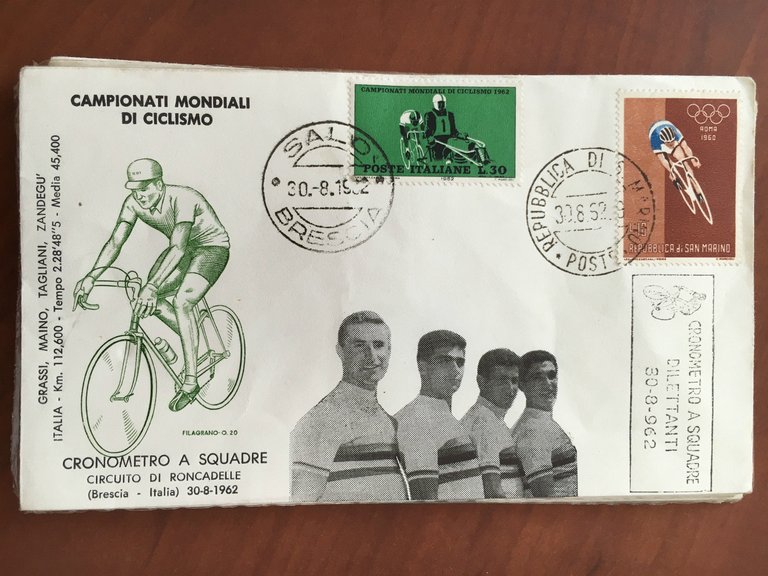 Mondiali di ciclismoCRONOMETRO A SQUADRERoncadella Brescia 30-08-1962Grassi Maino Tagliani Zandegùbusta commemorativa con francobolli Campionati Mondiali Ciclismoannullo della manifestazionein buono statoE21774