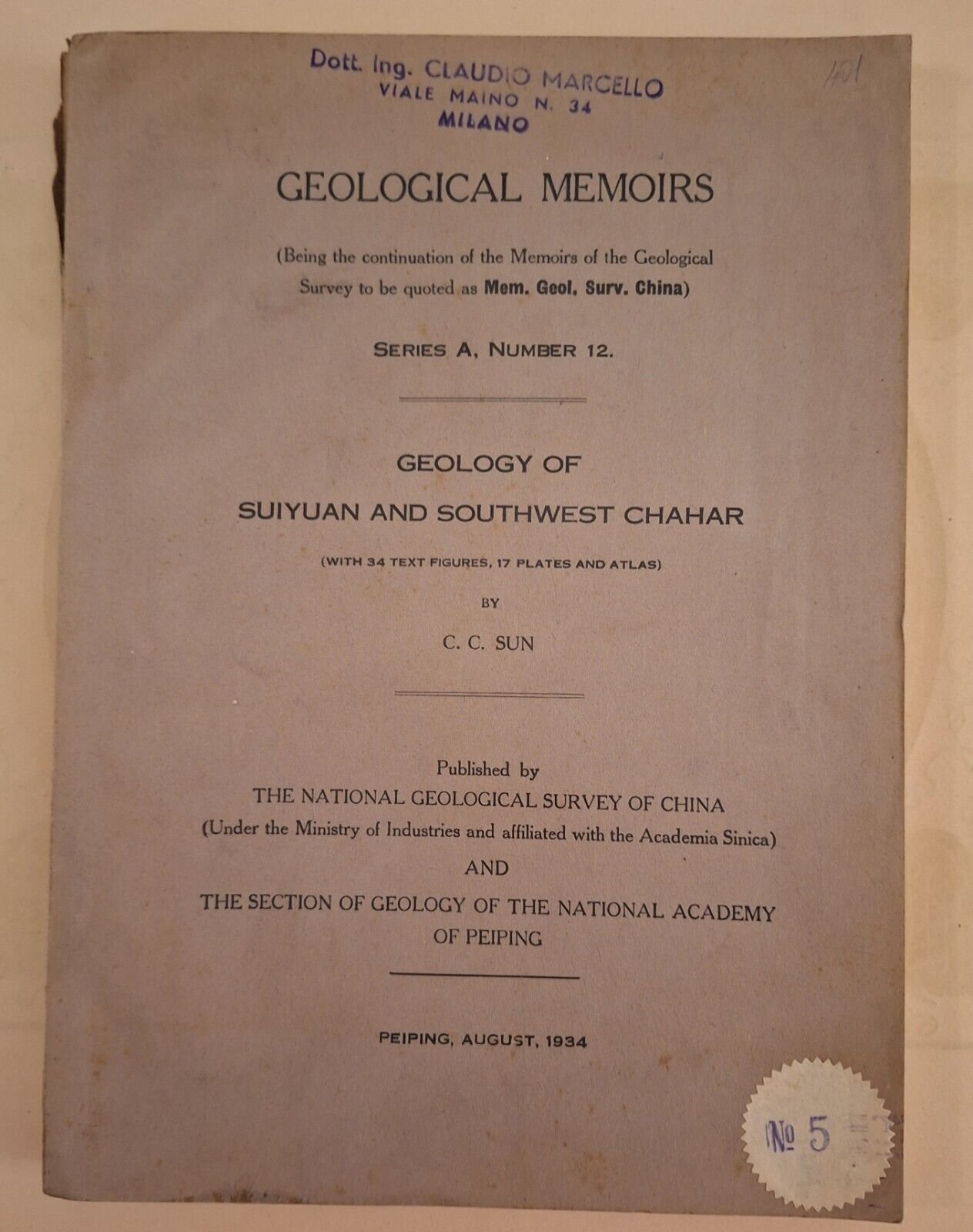 C.C. SUN GEOLOGICAL MEMOIRS GEOLOGY OF SUIYUAN AND SOUTHWEST CHAHAR PEIPING 1934In 8° grande, legatura editoriale, copertina illustrata, ill. in b/n.Testo in inglese e in cinese.Lievissimi segni alla copertina. Pagine fresche e pulite.