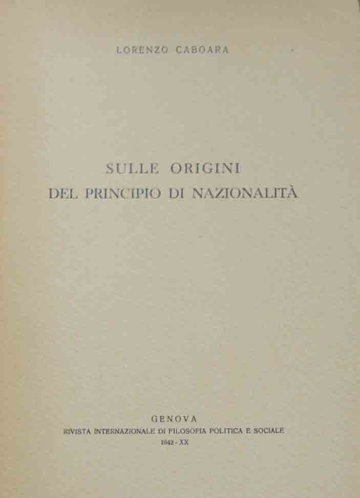 Lorenzo Caboara, Sulle origini del principio di nazionalità, Rivista internazionale di filosofia politica e sociale, Genova 1942, pp. 83, cm 25, br. ed. Estratto dal fasc. 1-2 del vol. II (II serie) della Rivista internazionale di filosofia politica e sociale (Genova, gennaio-aprile 1942). Indice: Etnicarchia e nazionalità. Opinione di Del Vecchio e critica del Patetta – Aspetto etnico e aspetto politico del principio di nazionalità nella sua storia – Il sentimento nazionale nella tradizione italiana: patriottismo ed etnicarchia – Il concetto di nazione nel sistema romagnosiano – Il principio di nazionalità dopo Romagnosi – L’idea della nazione in Giuseppe Mazzini – Conclusione – Appendice: Notiziario bibliografico. Qualche sporadica fioritura, carta lievemente brunita, per il resto perfetto. Intonso. Raro.