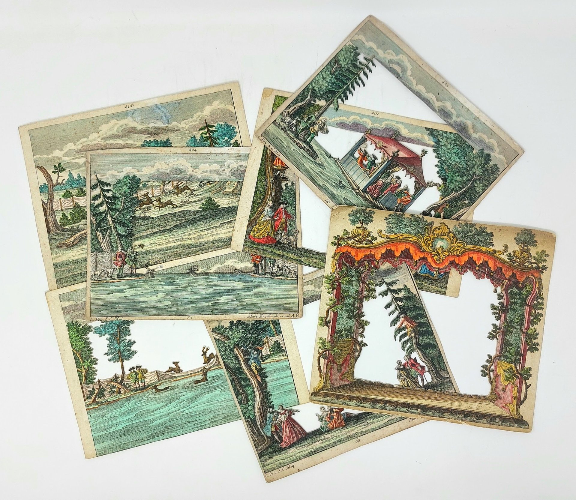 >serie di sette incisioni in rame colorate e ritagliate a mano (167x206 mm) montate su cartone. Comprende un frontespizio (intitolato e numerato a mano "400" a inchiostro sul verso) e 6 tavole numerate 401-406 a stampa nel margine superiore. Su tre delle tavole compare la firma "Cum Priv. S.C. Maj. - Mart. Engelbrecht excud. A.V." nel margine inferiore (molto probabilmente è stata rifilata nelle altre tavole); esemplare con lievi segni di usura ai margini, un po' polveroso, ma vivida colorazione e taglio preciso; in eccellente stato di conservazione, nonostante la sua fragilità e il suo utilizzo a scopo di intrattenimento per quasi tre secoli. Vi è rappresentata una scena di caccia sul lago, piuttosto inusuale ma molto animata, con cacciatori a cavallo e cani, cervi che corrono e nuotano, suonatori di corno sullo sfondo; in mezzo al lago naviga un elegante capanno di caccia galleggiante popolato da cacciatori, gentiluomini e gentildonne; uomini e donne di corte, in primo piano, siedono, passeggiano o, arrampicati sugli alberi, osservano i cervi da lontano.
