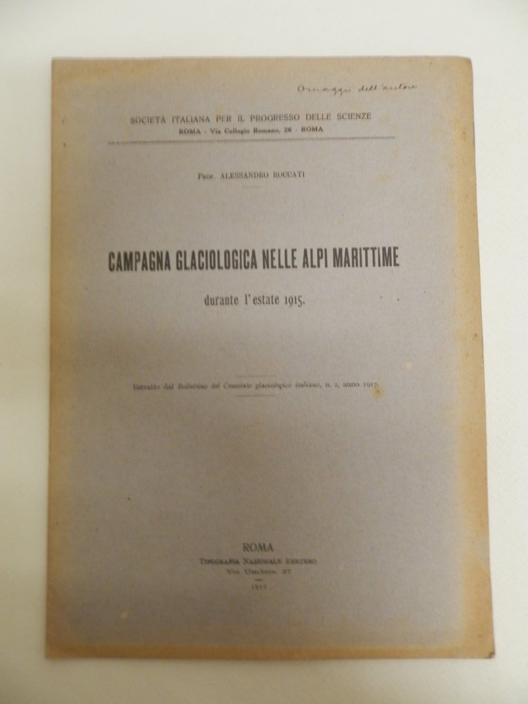 8^, pp. 10, 4 tavole fuori testo, brossura editoriale, titolo al piatto, estratto dal Bollettino del comitato glaciologico italiano, 11, 2, anno 1917. Esemplare molto buono. *** TUTTI I NOSTRI LIBRI SONO VISIBILI PREVIO CONTATTO MAIL O TELEFONO NELLA NUOVA SEDE DI MILANO: LIBRERIA COSMOPOLIS, VIA JOMMELLI, 22. ***