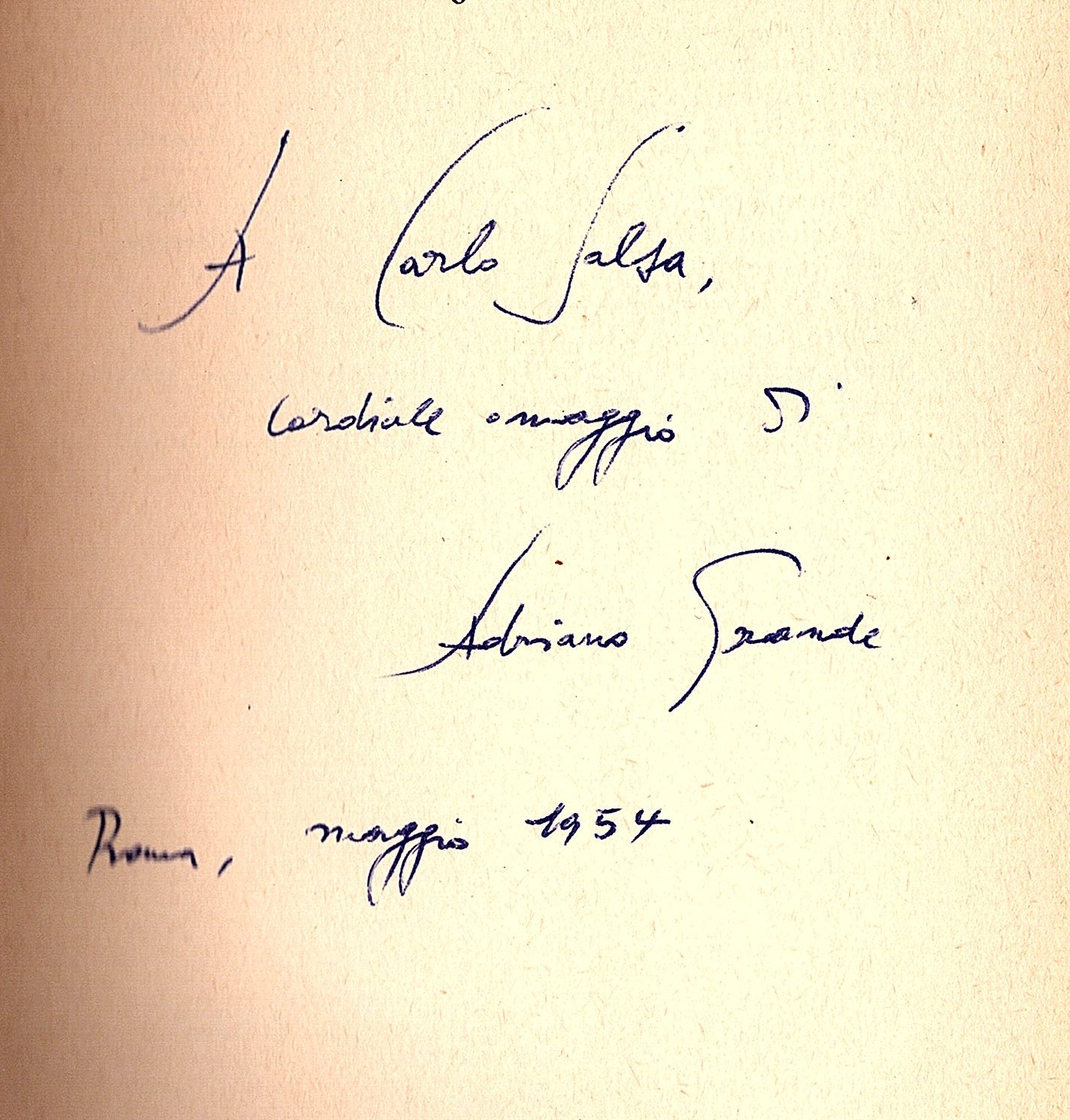 In-16° (19.5x13.5 cm), brossura editoriale a risvolti paratestuali, titoli al dorso e al piatto anteriore figurato (Armando Nocentini). Pp 56, (2). Collana Orfeo, poesia del nostro tempo, 6. Ottimo esemplare entro velina con dedica manoscritta dell'autore al giornalista e scrittore Carlo Salsa alla pagina di occhietto. Si acclude lettera composta e firmata a macchina da scrivere e siglata a penna rossa di Salsa in risposta all'omaggio di Grande. Edizione originale in volume di questo poemetto pubblicato in forma diversa in Maestrale nel 1938. Interessante la nota dell'autore che indica la via per poter comprendere le ragioni della differenti stesure essenzialmente fondate su considerazioni polemiche e critiche riprese da Salsa nella lettera di cui sopra. Cfr. Gambetti-Vezzosi, p. 408.