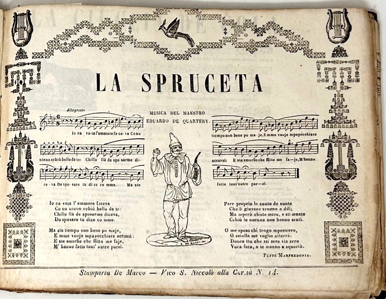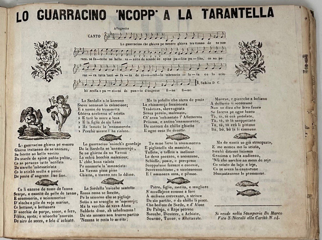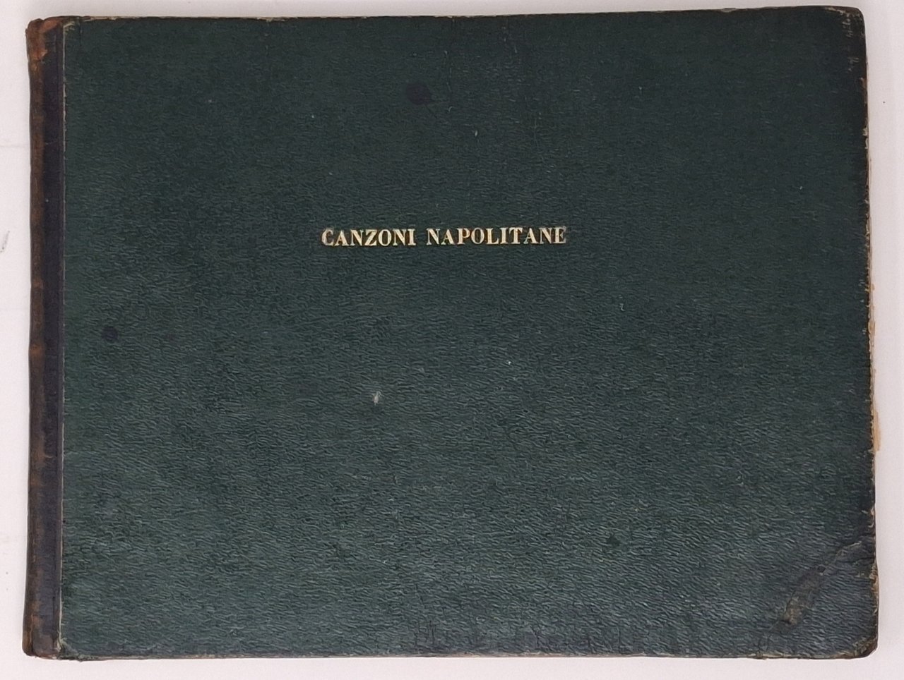 >In-8 oblungo (mm 95x75), 37 canzoni impresse su 38 fogli; legatura mezza pelle, titolo al centro del piatto superiore e filetti oro al dorso (piccoli difetti). Meraviglioso assieme di fogli volanti “spurii” con testo musicale su pentagramma ed a stampa, canzoni per canto e pianoforte, alcune arricchite da fregi ed illustrazioni. Impresso in litografia su carta ruvida e leggera. Questi "fogli volanti” con piccole incisioni stampati soltanto al recto con musica e testo, furono fondamentali per la diffusione del repertorio vocale napoletano, permettendo uno scambio interculturale fra ascoltatori appartenenti a classi sociali diverse su temi politici e di costume. Le Canzoni sono state tutte impresse dalla "Stamperia De Marco “, raffinata stamperia che mirava ad una clientela piccolo e medio borghese, spesso fregiava i suoi fogli con la graziosa incisione di un pulcinella come marchio di fabbrica e riportava lo spartito della melodia su cui si cantava il brano. Discreto stato di conservazione, qualche piccolo strapppetto, arrossatura e macchietta marrone.