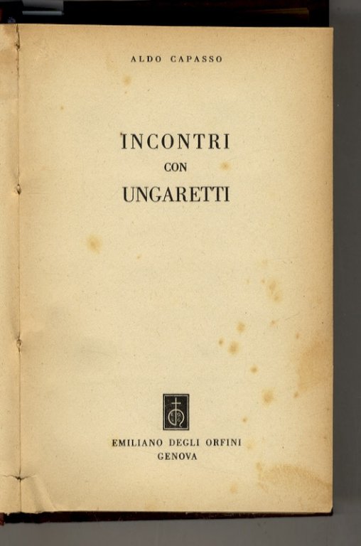CAPASSO Aldo, Incontri con Ungaretti. Genova, Emiliano degli Orfini, 31.12.1932, pp. 162, (6). "Collezione degli Scrittori Nuovi", n. 3. (Unito:) UNGARETTI Giuseppe, Allegria di Naufragi. Firenze, Vallecchi, s.d. (1919), pp. 245, (3). (Unito:) UNGARETTI Giuseppe, Sentimento del tempo. Con un saggio di Alfredo Gargiulo. Firenze, Vallecchi, 1933, pp. 170, (2).