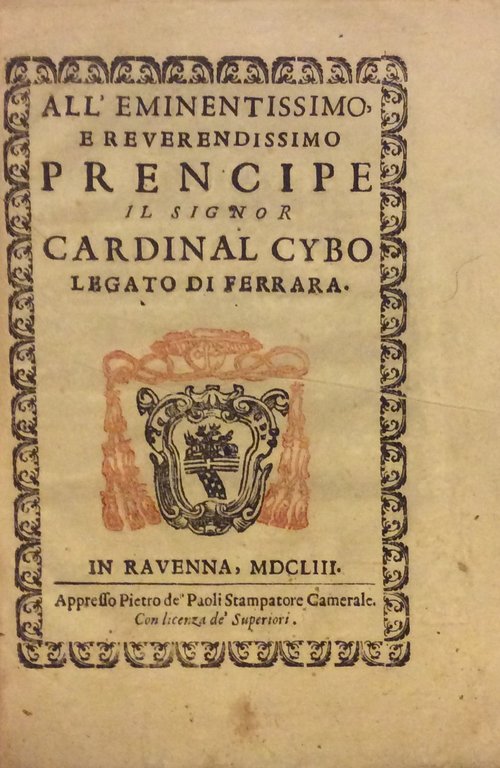 CAPITOLI, & CONVENTIONI IN MATERIA DE FIUMI, E FOSSI PUBBLICI, E PONTI SOPRA A QUESTE ORDINATE, E STABILITE FRA LA COMUNITA' di BAGNACAVALLO... - All'Emin.mo, Rever.mo Prencipe il Signor Cardinal Cybo Legato di Ferrara.