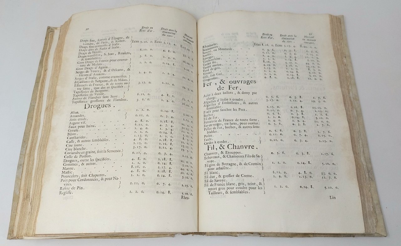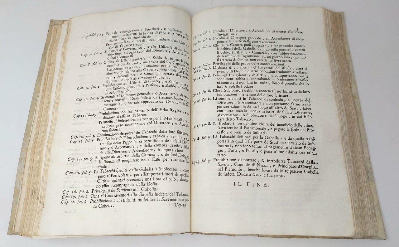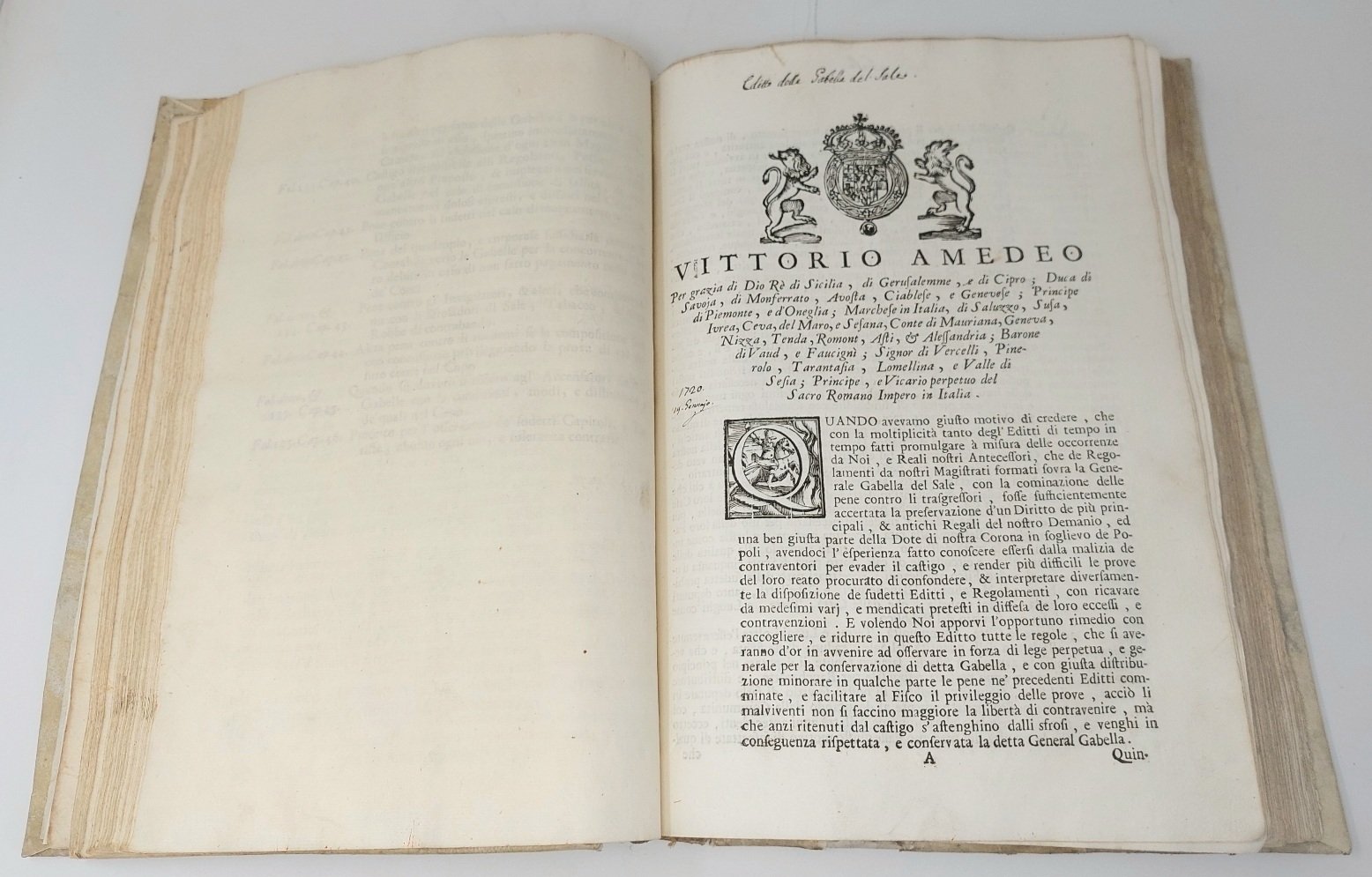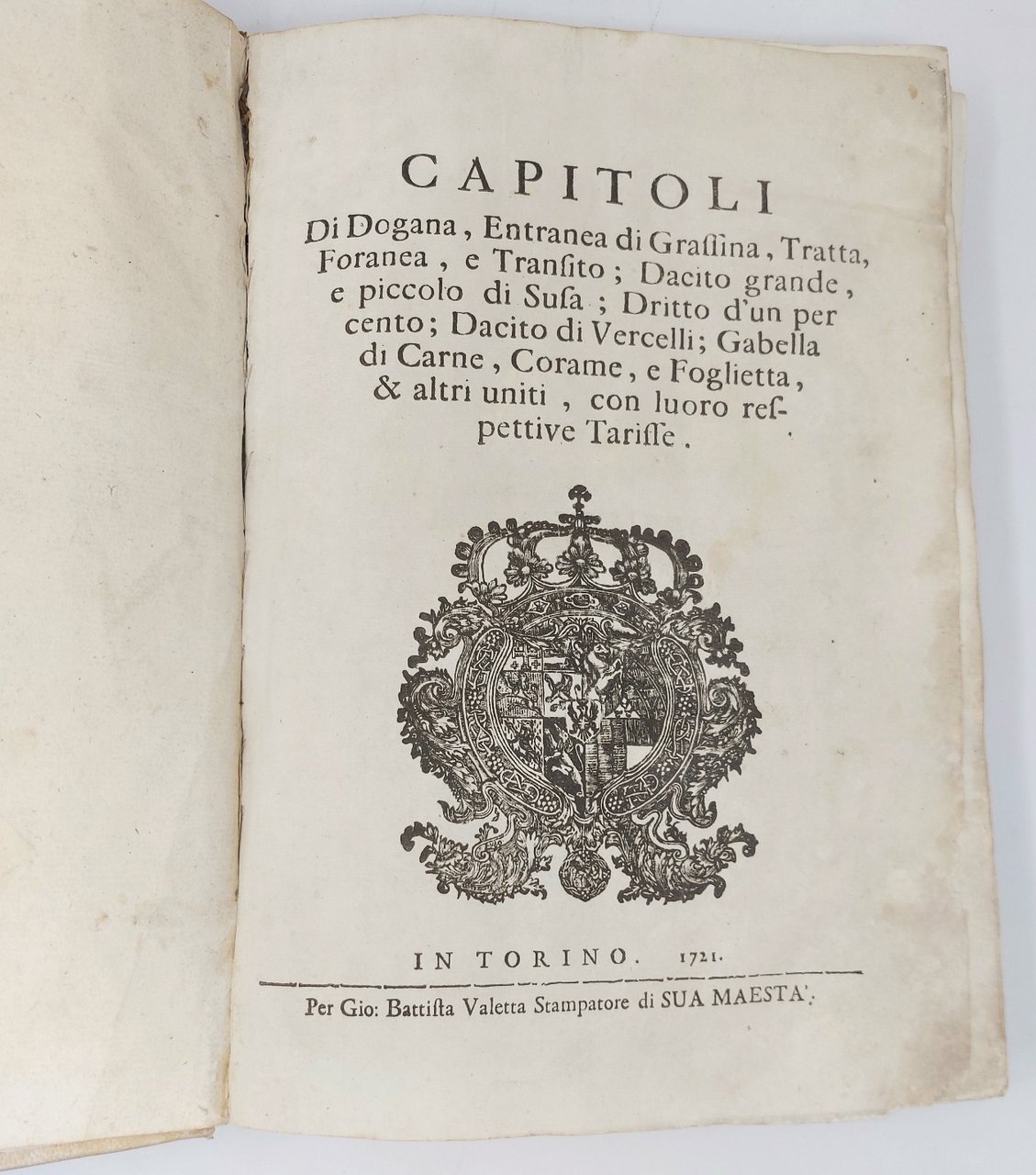 >Miscellanea in volume in-folio, legatura del XVIII secolo in pergamena antica, titolo manoscritto al dorso e al piatto anteriore. Comprende testi in italiano e in francese: 1. Dacito di Susa, Torino 1721, pp. 136+26 di Indice con dettaglio delle tariffe e delle varie mercanzie; 2. Editto delle Gabelle e del sale, Torino 1720, pp. 20+4 di Indice; 3. Editto della Gabella del Tabacco, Torino 1721, pp. 12+3 di Indice 4. Editto della Gabella dell'Acquavite, Torino 1721, pp. 12+2 di Indice 5. Editto della Gabella su carta bollata, Torino 1721, pp. 24 6. Articoli di Dogana, Torino 1721 pp. 118 7. Articoli di Dogana, Torino 1721, pp. 31 8. Editto sulla Carta bollata, Torino 1720, pp. 10 In fine indice manoscritto di tutti gli editti raccolti. Ottimo esemplare, freschissimo. Non in Surgo, Manno I, 1887 solo per il primo editto.