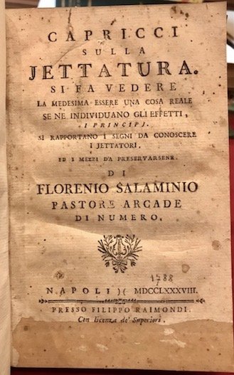 Capricci sulla jettatura. Si fa vedere la medesima essere una cosa reale se ne individuano gli effetti, i principj. Si rapportano i segni da conoscere i jettatori, ed i mezzi da preservarsene di Florenio Salaminio pastore Arcade di numero | Rare and modern books | Marugj Giovanni Leonardo