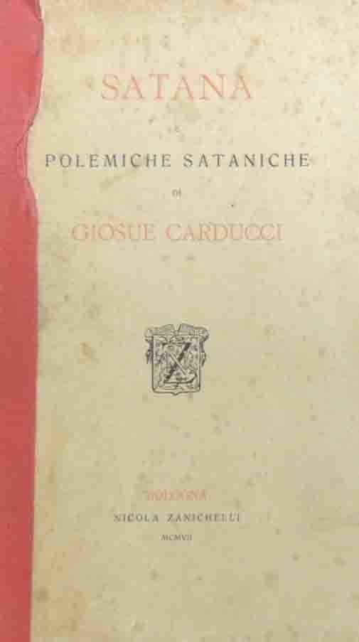 Giosue Carducci, Satana e polemiche sataniche, Nicola Zanichelli, Bologna 1907, pp. 76, testatine e finalini decorati, cm 17, br. ed. Tracce d’uso alla brossura, con dorso restaurato con rinforzo in tela e qualche piccola mancanza ai margini, ma interno ben conservato, salvo sporadici segnetti di biro, fioriture e leggere bruniture.