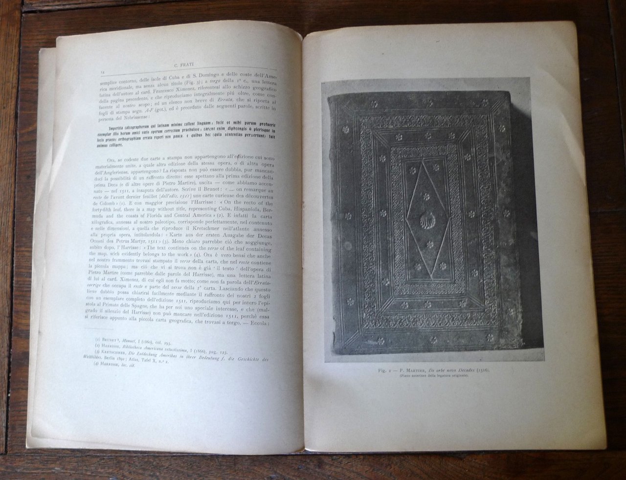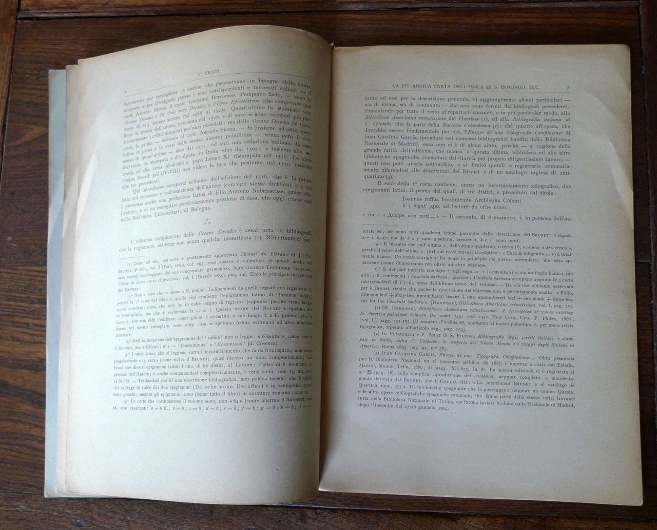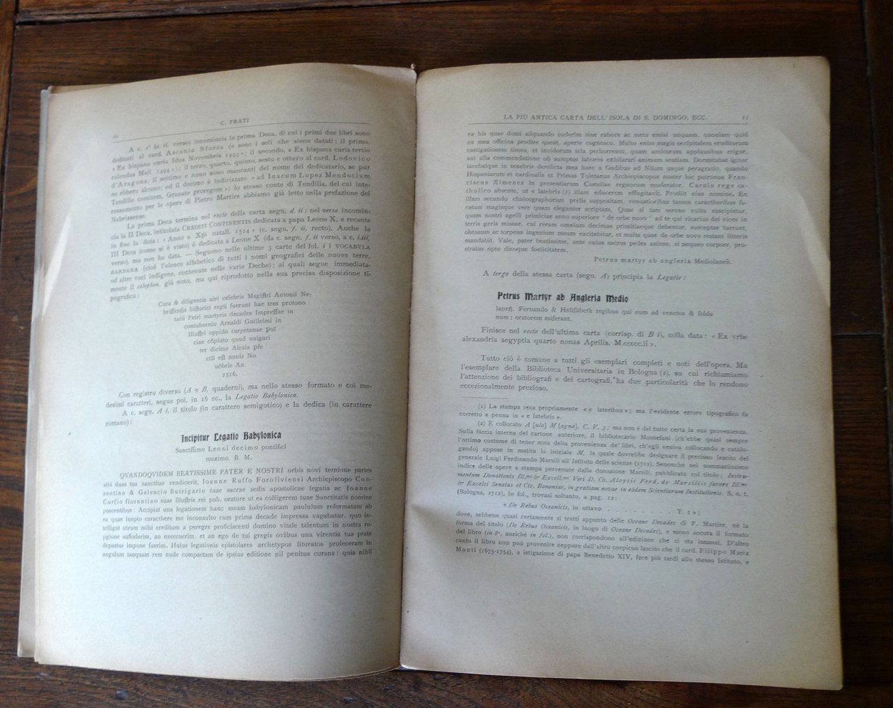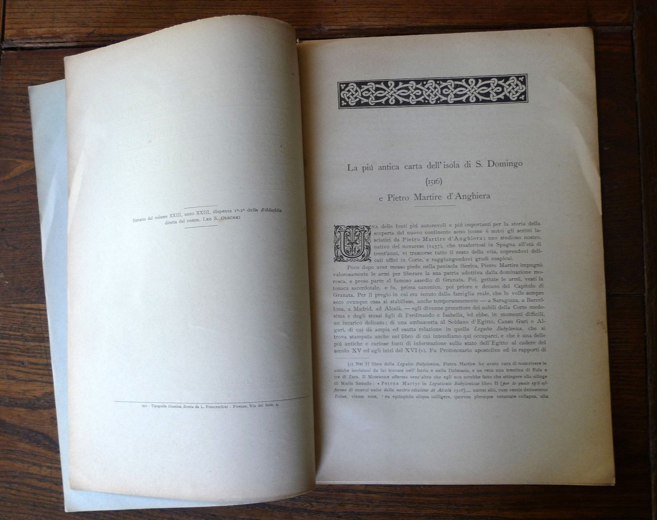 Carlo Frati,LA PIÙ ANTICA CARTA DELL'ISOLA DI S.DOMINGO (1516) E PIETRO MARTIRE D'ANGHIERA.Estratto dal volume XXIII, anno XXIII, dispensa 1a-2a della BIBLIOFILIAdiretta dal comm. Leo S. Olschky,Leo S. Olschky Editore, Firenze 1921,brossura, 30x20 cm., pp.24,alcune illustrazioni in bianco e nero,peso: g.400cod.10151CONDIZIONI DELL'OPUSCOLO: accettabili,strappetti ed imperfezioni alla copertina,la copertina e la prima pagina sono parzialmente staccate,pagine ingiallite,parzialmente intonso (fogli chiusi)
