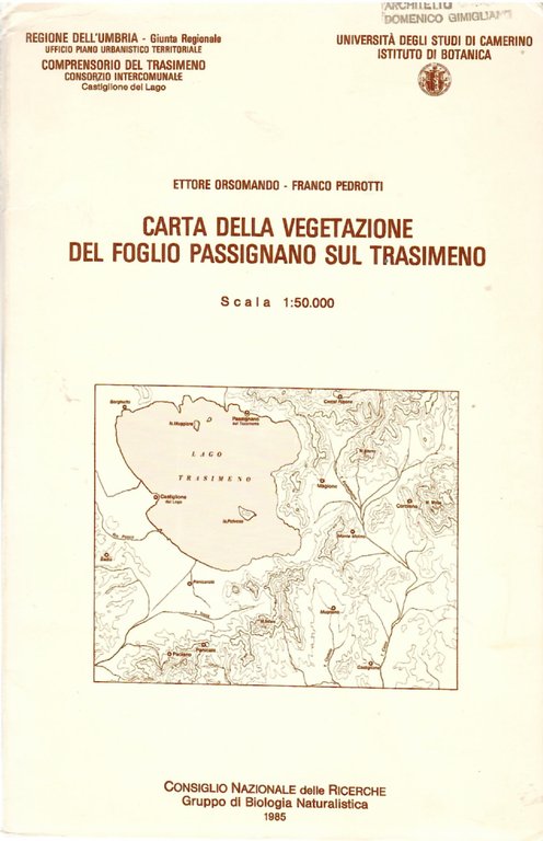 Carta a colori del Lago Trasimeno e del suo comprensorio più volte ripiegata nella sua custodia originale con indicazione geobotanica delle varie essenze con , in più, la carta ipsometrica, la carta geolitologica, la carta pluviotermica, la carta della vegetazione potenziale e la carta delle aree di interesse geobotanico riportate a margine. Programma di cartografia della vegetazione delle Marche e dell'Umbria a cura dell'Istituto di Botanica dell'Università di Camerino.