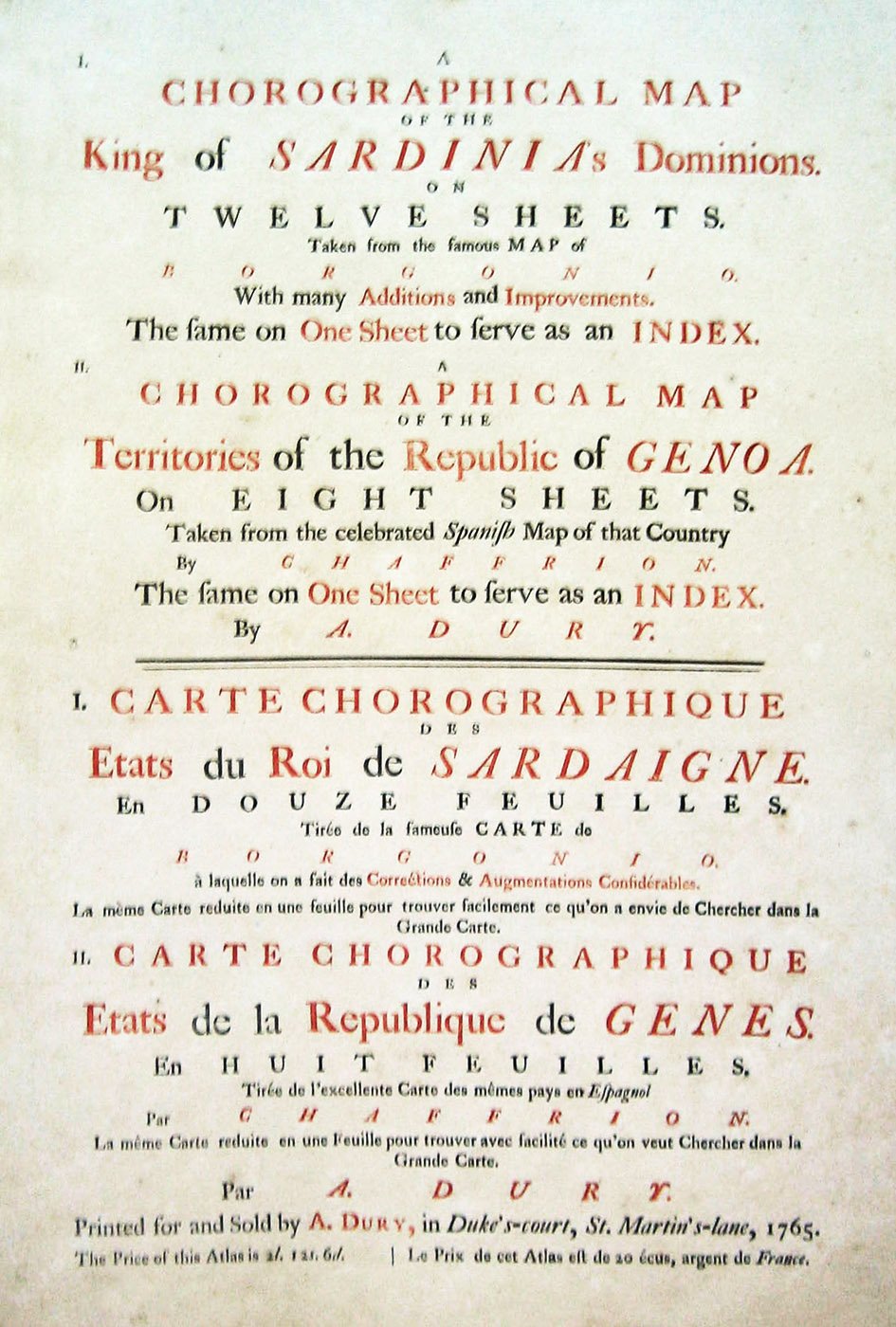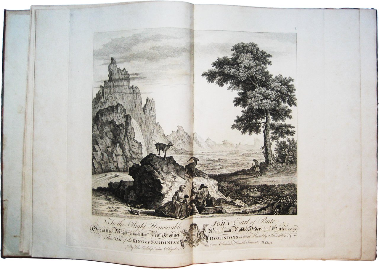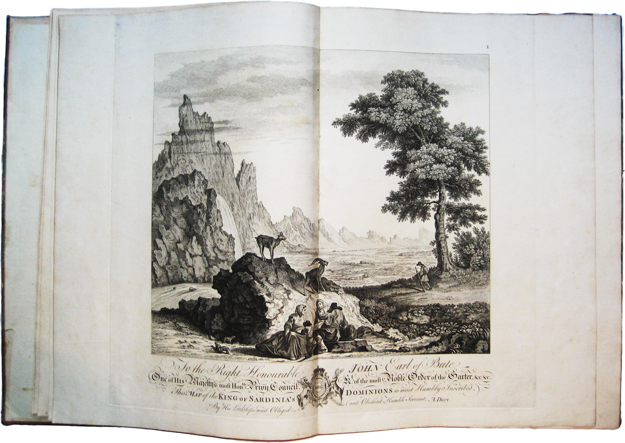 >Album in-folio (mm.530x400), legatura coeva mezza pelle e ang., dorso a nervi con titolo oro. Due parti in un vol., titolo generale in inglese e francese: I) carta d'assieme, dedica figurata al nobile John Earl of Bute, 10 carte topografiche per il Borgonio 1680, tutti incisi in rame su doppia pagina. II) Doppio foglio a stampa di spiegazioni e istruzioni; una carta generale degli Stati della Repubblica di Genova; 8 carte su doppia pagina dell'atlante di Chaffrion del 1685(una con la Sardegna e la Corsica). Confini dipinti. Magnifico atlante che migliora le conoscenze cartografiche del Borgonio e dello Chaffrion su Piemonte e zone alpine, particolarmente del Monte Bianco e della Liguria, Esemplare completo, perfettamente conservato. Cfr. Aliprandi, Cartografia Alpina, 49/1, 50, e 50/1, 50/2.