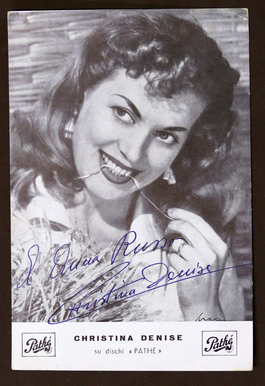 Cartolina Dischi Pathè con Autografo e dedica della cantante Christina Denise - 1955 ca. Dimensioni 10 x 15 cm Per appassionati studiosi e collezionisti