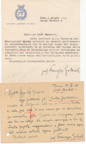 AUTOGRAFOAutore di innumerevoli libri, saggi, articoli, traduzioni e recensioni, Gabrieli fu grande esperto di lingue orientali. Insegnò all'Università di Palermo, all'Istituto Universitario Orientale di Napoli, e all'Università La Sapienza di Roma. "[…] Debbo scrivere nella "Gazzetta del Mezzogiorno" alcuni articoli di recenti pubblicazioni leonardesche […]. Parlerei volentieri del prossimo volume della Fumagalli, Eros e Leonardo […]" (Lettera). "[…] veggo pubblicati gli “Scrittori garibaldini” raccolti da Stuparich. Non so se l’amico autore vi abbia dato il mio nome per un esemplare per recensione […]" (Cartolina).