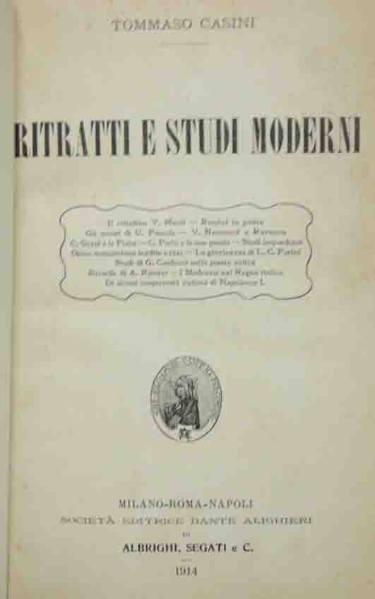 Tommaso Casini, Ritratti e studi moderni, Società Editrice Dante Alighieri di Albrighi, Segati e C., Milano 1914, pp. 474, cm 19, bella legatura in mezza pelle con titoli e fregi in oro al dorso e piatti in carta gigliata. Il cittadino V. Monti – Rossini in patria – Gli amori di U. Foscolo – V. Nanucci a Ravenna – G. Gozzi e le fiabe – C. Porta e le sue poesie – Studi leopardiani – Opere manzoniane inedite e rare – La giovinezza di L. C. Farini – Studi di G. Carducci sulla poesia antica – Ricordo di A. Romizi – I modenesi nel Regno italico – Di alcuni cooperatori italiani di Napoleone I. Firma d’appartenenza e data alla prima pagina di guardia. Minime abrasioni al dorso, carta uniformemente brunita, per il resto perfetto.