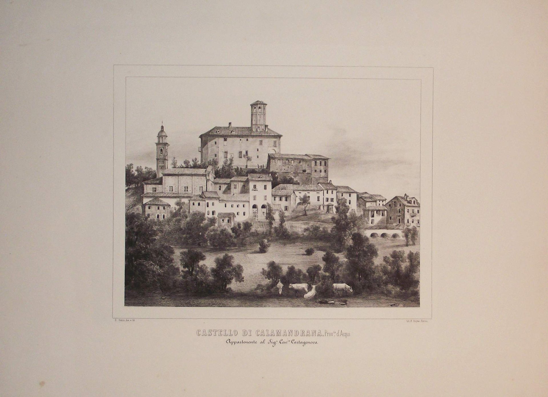>Litografia originale circa 375x440 mm, firmata da Enrico Gonin quale autore del disegno e da J. Junck, Fr.lli Doyen o D.Festa quali litografi. Bella veduta animata da personaggi in primo piano, è l'unica incisione di Calamandrana realizzata prima della metà dell'800. Impressi nel margine inferiore sono il titolo e l'indicazione della famiglia nobile proprietaria. Bell'esemplare a pieni margini tratto dall'Album delle principali Castella Feudali della Monarchia di Savoia. Torino, Fontana, 1841-57, contenente 200 tavole litografiche disegnate e litografate da Enrico Gonin impresse a Torino da D. Festa, Junck e Doyen, celebre serie di vedute dei castelli e ville del Piemonte e Valle d'Aosta Enrico Gonin (Torino, 1798-1856), fratello del più noto pittore Francesco; discepolo di Pietro Giovanni Palmieri, ereditò da questi l'arte litografica, e lavorò profusamente per gli editori Marietti, Doyen e Fontana. Queste vedute, espressione di un tardo romanticismo pittorico, oltre ai loro pregi artistici e alla loro importanza per la storia dell'arte litografica in Piemonte, costituiscono un documento di eccezionale valore per lo studio del patrimonio monumentale del Piemonte.Buon esemplare a pieni margini.