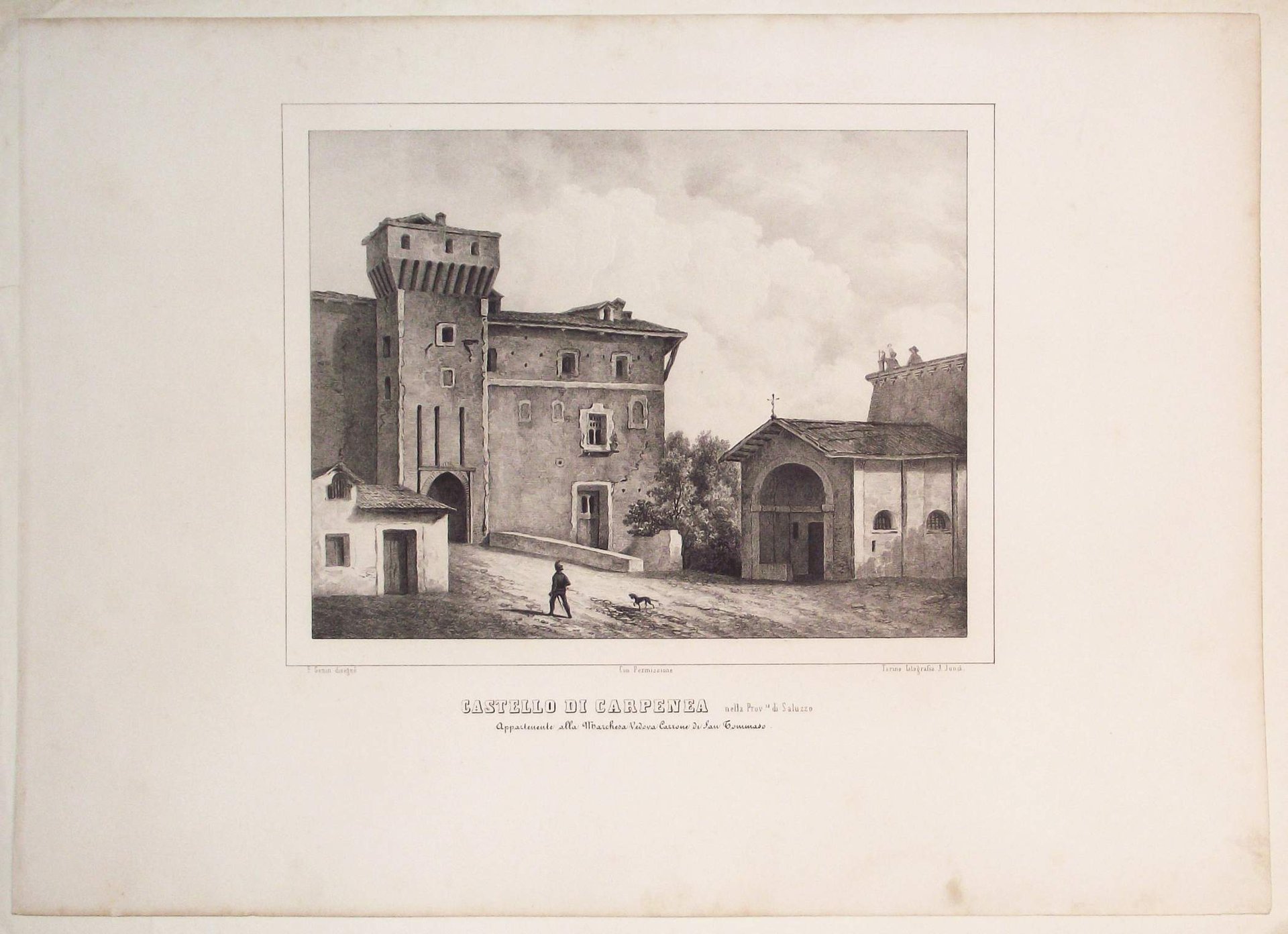 >Litografia originale circa 465x625 mm, firmata da Enrico Gonin quale autore del disegno e da J. Junck, Fr.lli Doyen o D.Festa quali litografi. Bella veduta del castello di Carpenea nel comune di Casalgrasso, animata da personaggi in primo piano. Impressi nel margine inferiore sono il titolo e l'indicazione della famiglia nobile proprietaria. Bell'esemplare a pieni margini tratto dall'Album delle principali Castella Feudali della Monarchia di Savoia. Torino, Fontana, 1841-57, contenente 200 tavole litografiche disegnate e litografate da Enrico Gonin impresse a Torino da D. Festa, Junck e Doyen, celebre serie di vedute dei castelli e ville del Piemonte e Valle d'Aosta Enrico Gonin (Torino, 1798-1856), fratello del più noto pittore Francesco; discepolo di Pietro Giovanni Palmieri, ereditò da questi l'arte litografica, e lavorò profusamente per gli editori Marietti, Doyen e Fontana. Queste vedute, espressione di un tardo romanticismo pittorico, oltre ai loro pregi artistici e alla loro importanza per la storia dell'arte litografica in Piemonte, costituiscono un documento di eccezionale valore per lo studio del patrimonio monumentale del Piemonte.Buon esemplare a pieni margini.