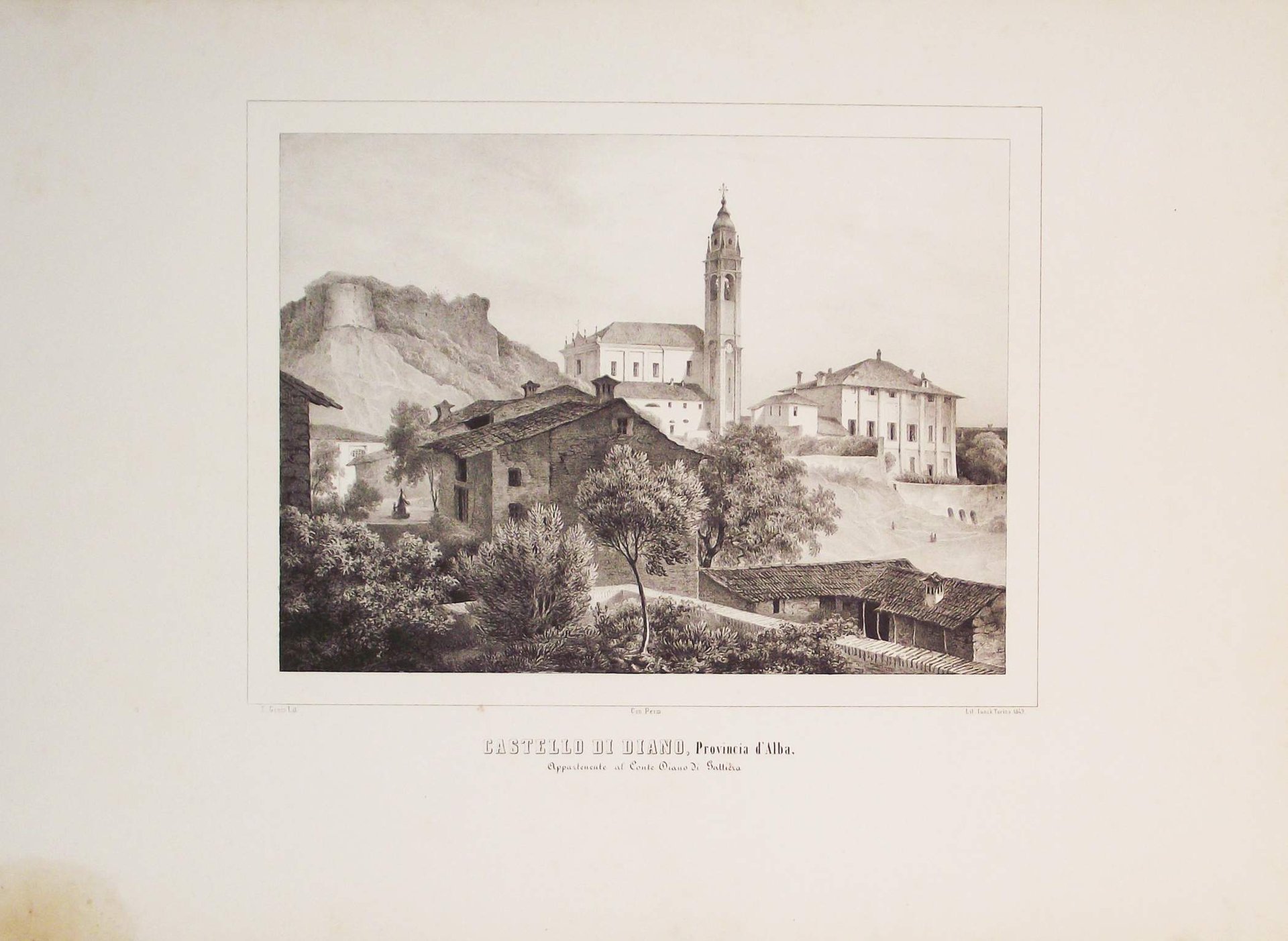 >Litografia originale circa 410x575 mm, firmata da Enrico Gonin quale autore del disegno e da J. Junck, Fr.lli Doyen o D.Festa quali litografi. Bella veduta animata da personaggi in primo piano, è l'unica incisione di Diano, realizzata prima della metà dell'800. Impressi nel margine inferiore sono il titolo e l'indicazione della famiglia nobile proprietaria. Bell'esemplare a pieni margini tratto dall'Album delle principali Castella Feudali della Monarchia di Savoia. Torino, Fontana, 1841-57, contenente 200 tavole litografiche disegnate e litografate da Enrico Gonin impresse a Torino da D. Festa, Junck e Doyen, celebre serie di vedute dei castelli e ville del Piemonte e Valle d'Aosta Enrico Gonin (Torino, 1798-1856), fratello del più noto pittore Francesco; discepolo di Pietro Giovanni Palmieri, ereditò da questi l'arte litografica, e lavorò profusamente per gli editori Marietti, Doyen e Fontana. Queste vedute, espressione di un tardo romanticismo pittorico, oltre ai loro pregi artistici e alla loro importanza per la storia dell'arte litografica in Piemonte, costituiscono un documento di eccezionale valore per lo studio del patrimonio monumentale del Piemonte.Buon esemplare a pieni margini.