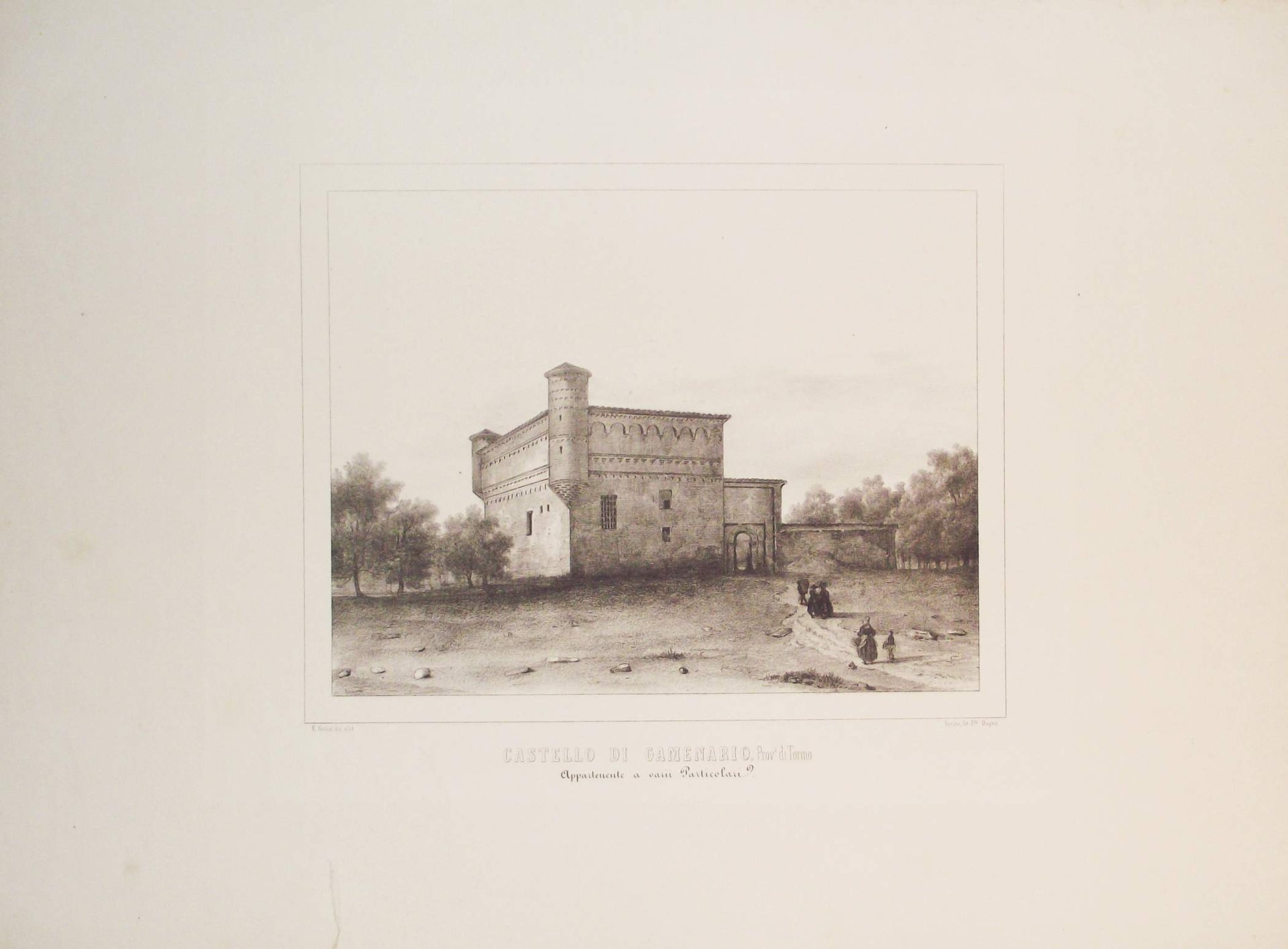>Litografia originale circa 460x645 mm, firmata da Enrico Gonin quale autore del disegno e da J. Junck, Fr.lli Doyen o D.Festa quali litografi. Bella veduta animata da personaggi in primo piano, è l'unica incisione di Gamerario realizzata prima della metà dell'800. Impressi nel margine inferiore sono il titolo e l'indicazione della famiglia nobile proprietaria. Bell'esemplare a pieni margini tratto dall'Album delle principali Castella Feudali della Monarchia di Savoia. Torino, Fontana, 1841-57, contenente 200 tavole litografiche disegnate e litografate da Enrico Gonin impresse a Torino da D. Festa, Junck e Doyen, celebre serie di vedute dei castelli e ville del Piemonte e Valle d'Aosta Enrico Gonin (Torino, 1798-1856), fratello del più noto pittore Francesco; discepolo di Pietro Giovanni Palmieri, ereditò da questi l'arte litografica, e lavorò profusamente per gli editori Marietti, Doyen e Fontana. Queste vedute, espressione di un tardo romanticismo pittorico, oltre ai loro pregi artistici e alla loro importanza per la storia dell'arte litografica in Piemonte, costituiscono un documento di eccezionale valore per lo studio del patrimonio monumentale del Piemonte.Buon esemplare a pieni margini.