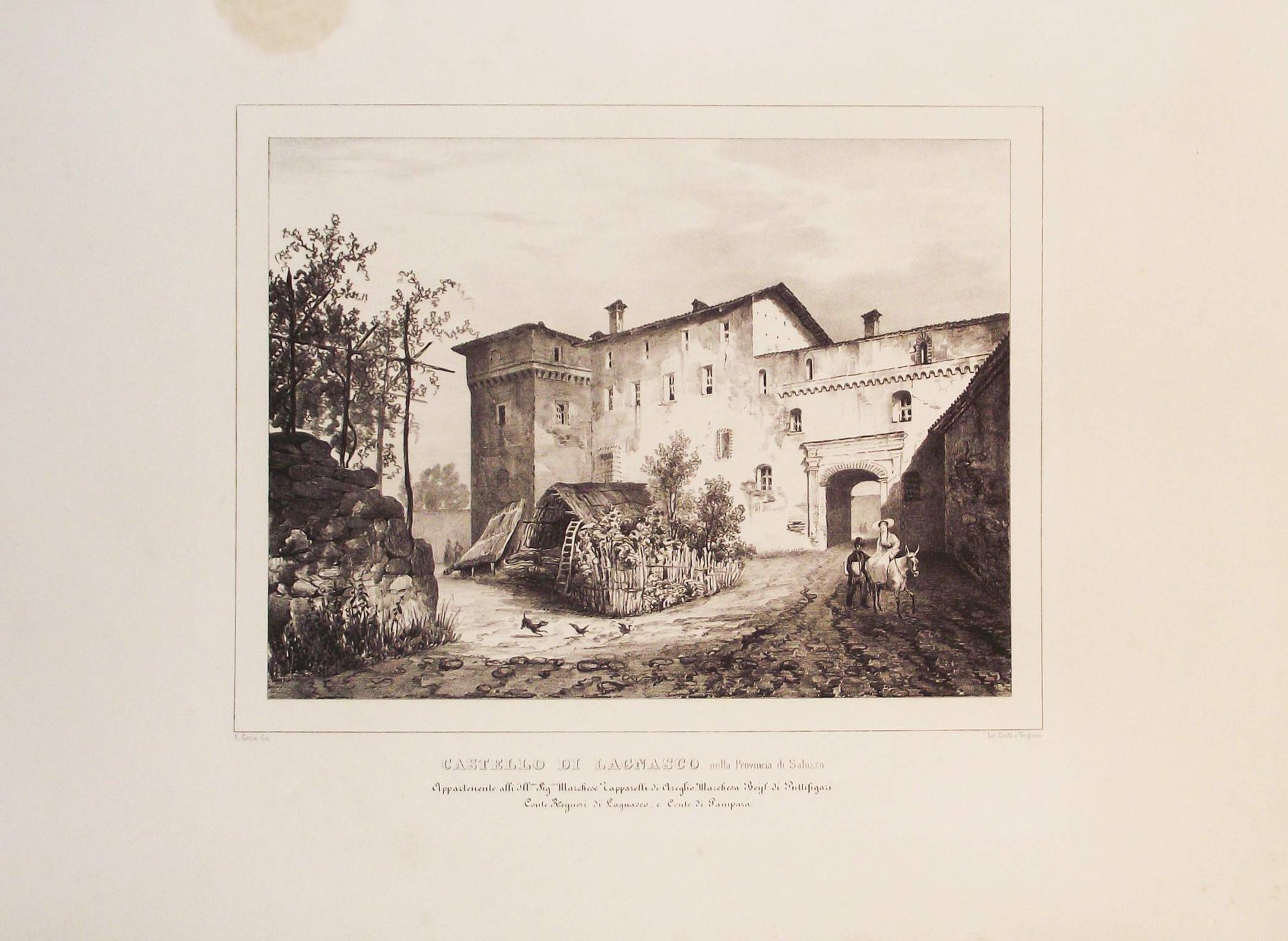>Litografia originale circa 410x570 mm, firmata da Enrico Gonin quale autore del disegno e da J. Junck, Fr.lli Doyen o D.Festa quali litografi. Bella veduta animata da personaggi in primo piano, è l'unica incisione di Lagnasco realizzata prima della metà dell'800. Impressi nel margine inferiore sono il titolo e l'indicazione della famiglia nobile proprietaria. Bell'esemplare a pieni margini tratto dall'Album delle principali Castella Feudali della Monarchia di Savoia. Torino, Fontana, 1841-57, contenente 200 tavole litografiche disegnate e litografate da Enrico Gonin impresse a Torino da D. Festa, Junck e Doyen, celebre serie di vedute dei castelli e ville del Piemonte e Valle d'Aosta Enrico Gonin (Torino, 1798-1856), fratello del più noto pittore Francesco; discepolo di Pietro Giovanni Palmieri, ereditò da questi l'arte litografica, e lavorò profusamente per gli editori Marietti, Doyen e Fontana. Queste vedute, espressione di un tardo romanticismo pittorico, oltre ai loro pregi artistici e alla loro importanza per la storia dell'arte litografica in Piemonte, costituiscono un documento di eccezionale valore per lo studio del patrimonio monumentale del Piemonte.Buon esemplare a pieni margini.
