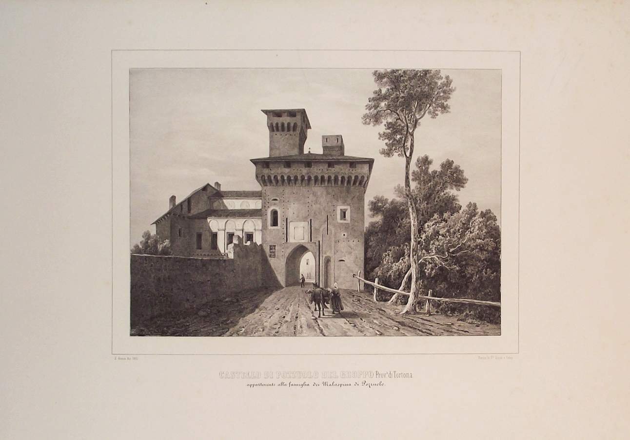 >Litografia originale circa 410x570 mm,firmata da Enrico Gonin quale autore del disegno e da J. Junck, Fr.lli Doyen o D.Festa quali litografi. Bella veduta animata da personaggi in primo piano, è l'unica incisione di Pozzuolo del Groppo realizzata prima della metà dell'800. Impressi nel margine inferiore sono il titolo e l'indicazione della famiglia nobile proprietaria. Bell'esemplare a pieni margini tratto dall'Album delle principali Castella Feudali della Monarchia di Savoia. Torino, Fontana, 1841-57, contenente 200 tavole litografiche disegnate e litografate da Enrico Gonin impresse a Torino da D. Festa, Junck e Doyen, celebre serie di vedute dei castelli e ville del Piemonte e Valle d'Aosta Enrico Gonin (Torino, 1798-1856), fratello del più noto pittore Francesco; discepolo di Pietro Giovanni Palmieri, ereditò da questi l'arte litografica, e lavorò profusamente per gli editori Marietti, Doyen e Fontana. Queste vedute, espressione di un tardo romanticismo pittorico, oltre ai loro pregi artistici e alla loro importanza per la storia dell'arte litografica in Piemonte, costituiscono un documento di eccezionale valore per lo studio del patrimonio monumentale del Piemonte.Buon esemplare a pieni margini.