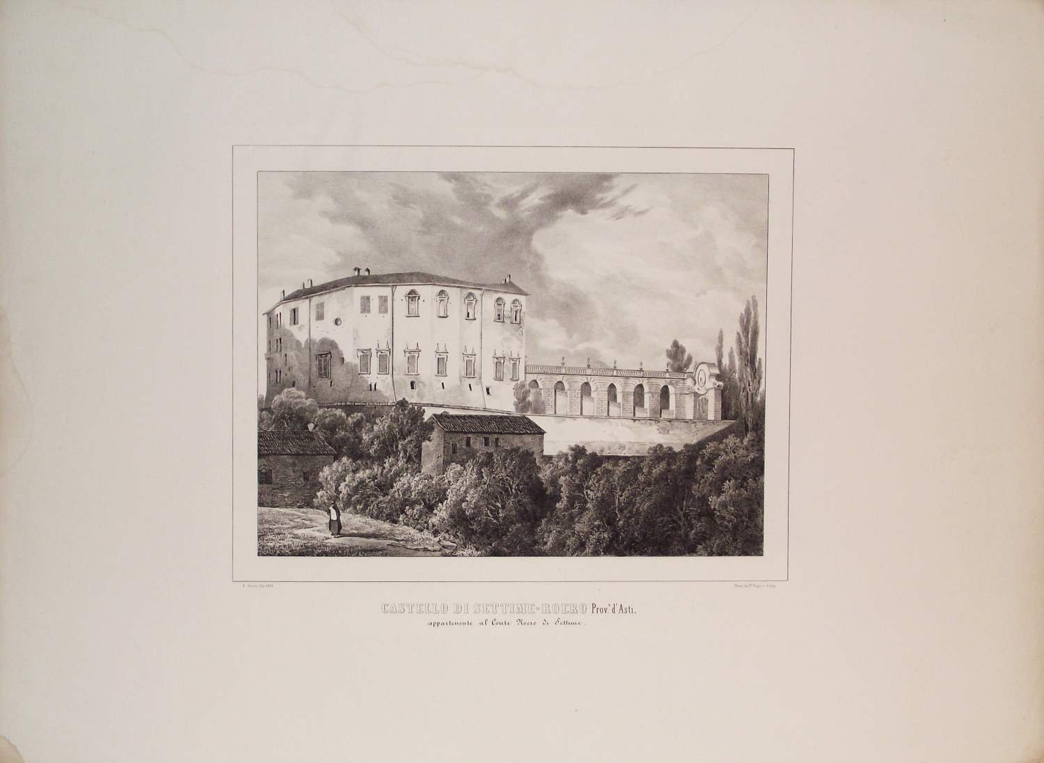 >Litografia originale circa 460x635 mm, firmata da Enrico Gonin quale autore del disegno e da J. Junck, Fr.lli Doyen o D.Festa quali litografi. Bella veduta animata da personaggi in primo piano, è l'unica incisione di Settime-Roero realizzata prima della metà dell'800. Impressi nel margine inferiore sono il titolo e l'indicazione della famiglia nobile proprietaria. Bell'esemplare a pieni margini tratto dall'Album delle principali Castella Feudali della Monarchia di Savoia. Torino, Fontana, 1841-57, contenente 200 tavole litografiche disegnate e litografate da Enrico Gonin impresse a Torino da D. Festa, Junck e Doyen, celebre serie di vedute dei castelli e ville del Piemonte e Valle d'Aosta Enrico Gonin (Torino, 1798-1856), fratello del più noto pittore Francesco; discepolo di Pietro Giovanni Palmieri, ereditò da questi l'arte litografica, e lavorò profusamente per gli editori Marietti, Doyen e Fontana. Queste vedute, espressione di un tardo romanticismo pittorico, oltre ai loro pregi artistici e alla loro importanza per la storia dell'arte litografica in Piemonte, costituiscono un documento di eccezionale valore per lo studio del patrimonio monumentale del Piemonte. Buon esemplare a pieni margini.