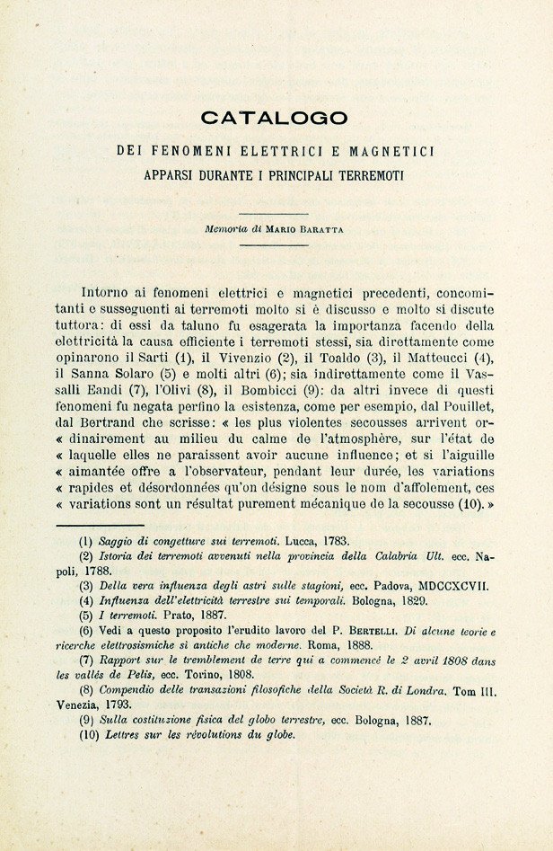 One of the first writings published by the geographer Baratta, the well-known author of a fundamental catalogue of historical earthquakes in Italy, I terremoti d’Italia (1901). Offprint from: Rendiconti della Società Italiana di Elettricità per progresso degli studi e delle applicazioni, i (1891). Clio, s.v., p. 307.